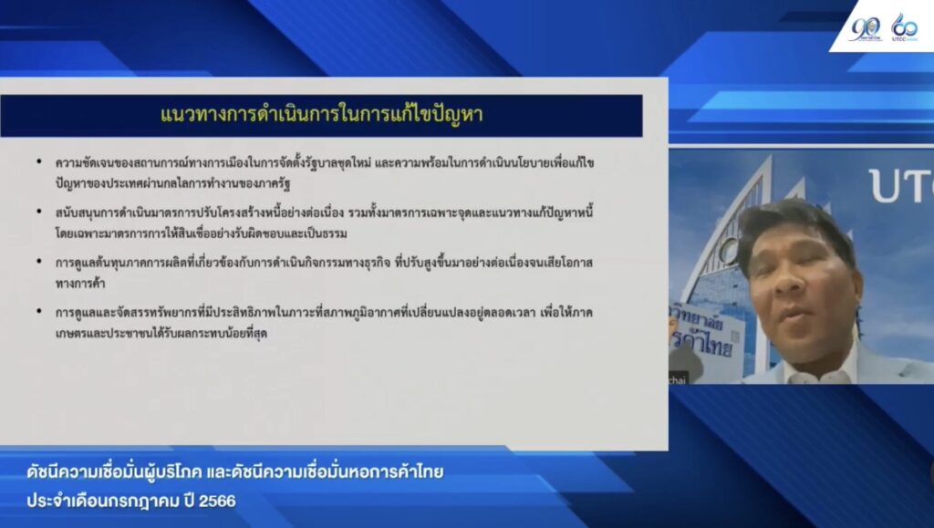 รศ.ดร.ธนวรรธน์ พลวิชัย อธิการบดีมหาวิทยาลัยหอการค้าไทยและประธานที่ปรึกษาศูนย์พยากรณ์เศรษฐกิจและธุรกิจ กล่าวถึงดัชนีความเชื่อมั่นผู้บริโภคประจำเดือนกรกฎาคม2566 ปรับตัวลดลงเป็นครั้งแรกในรอบ 14 เดือนตั้งแต่เดือนมิถุนายน 2565 เป็นต้นมา เนื่องจาก ผู้บริโภครู้สึกกังวลเกี่ยวกับความไม่แน่นอนในการจัดตั้งรัฐบาลและเสถียรภาพทางการเมืองหลังการเลือกตั้งและจัดตั้งรัฐบาล ซึ่งอาจส่งผลต่อการฟื้นตัวของเศรษฐกิจไทยในปัจจุบันและในอนาคค ส่งผลให้ความเชื่อมั่นของผู้บริโภคทุกรายการปรับตัวลดลง นอกจากนี้ผู้บริโภคยังคงมีความกังวลเกี่ยวกับค่าครองชีพที่ยังทรงตัวสูงโดยเฉพาะค่าไฟฟ้ารวมถึงความกังวลเกี่ยวกับสถานการณ์เศรษฐกิจโลกชะลอตัว ตลอดจนการปรับขึ้นอัตราดอกเบี้ยเพื่อแก้ไขปัญหาเงินเฟ้อของประเทศต่างๆ ทั่วโลก ที่อาจเป็นปัจจัยที่เพิ่มแรงกดดันของการฟื้นตัวของระบบเศรษฐกิจโลกเข้าสู่ภาวะเศรษฐกิจถดถอย ซึ่งส่งผลลบต่อการส่งออกของไทยทำให้การส่งออกในช่วงนี้หดตัวลง และมีผลกระทบในเชิงลบต่อกำลังซื้อของประชาชนในทุกภูมิภาค