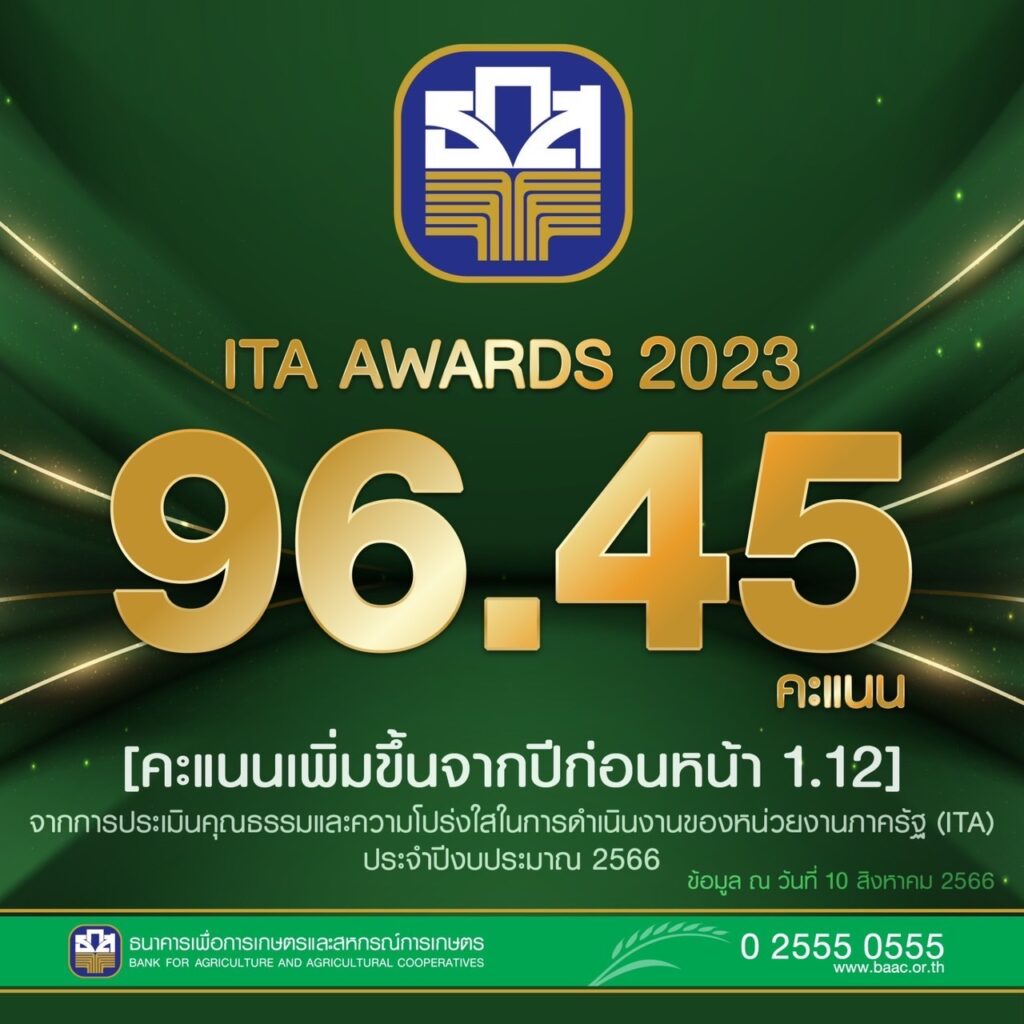 อย่างไรก็ตาม เมื่อวันที่ 10 สิงหาคม 2566 สำนักงานคณะกรรมการป้องกันและปราบปรามการทุจริตแห่งชาติ (ป.ป.ช.) โดยนายนิวัติไชย เกษมมงคล เลขาธิการคณะกรรมการ ป.ป.ช. ได้แถลงผลการประเมินคุณธรรมและความโปร่งใสในการดำเนินงานของหน่วยงานภาครัฐ (Integrity and Transparency Assessment : ITA) ประจำปีงบประมาณ 2566 ซึ่ง ธ.ก.ส. ได้รับคะแนน 96.45 สูงขึ้นกว่าปีก่อนหน้า 1.12 คะแนน แสดงถึงระดับคุณธรรมและความโปร่งใสในการดำเนินงานของธนาคาร และเป็นการประเมินที่มีจุดมุ่งหมายที่จะก่อให้เกิดการปรับปรุงพัฒนาด้านคุณธรรมและความโปร่งใสในหน่วยงานภาครัฐทั่วประเทศ และเป็นเครื่องมือหนึ่งในการขับเคลื่อนยุทธศาสตร์ชาติประเด็นการต่อต้านการทุจริต ธ.ก.ส. ขอขอบคุณเกษตรกรลูกค้าและผู้มีส่วนเกี่ยวข้องทุกภาคส่วนที่ร่วมสนับสนุน ซึ่ง ธ.ก.ส. ขอตั้งมั่นในคุณธรรมและพร้อมเพิ่มประสิทธิภาพและพัฒนางานตามหลักคุณธรรมและความโปร่งใสเพื่อขับเคลื่อนระบบเศรษฐกิจฐานรากของประเทศสู่ความมั่นคง มั่งคั่ง และยั่งยืนต่อไป.-สำนักข่าวไทย