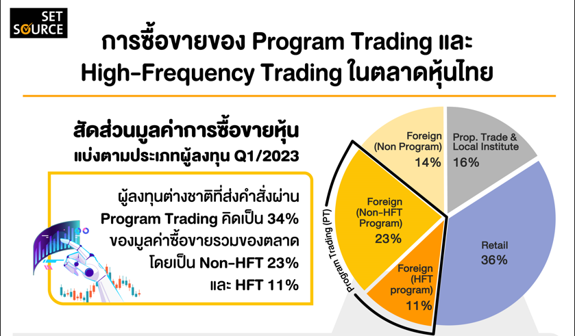 ปัจจุบันการส่งคำสั่งซื้อขายหุ้นโดยใช้โปรแกรมในการประมวลผลและตัดสินใจ หรือที่เรียกว่า Program Trading (PT) นั้น ได้รับความนิยมจากกลุ่มผู้ลงทุนอย่างมาก โดยในช่วงไตรมาสแรกของปี 2566 ผู้ลงทุนต่างชาติใช้การซื้อขายแบบ PT คิดเป็น 34% หรือ 1 ใน 3 ของมูลค่าซื้อขายรวมของตลาด โดยประมาณ 1 ใน 3 ของ PT กลุ่มนี้หรือ 11% จาก 34% เป็นการซื้อขายของกลุ่ม High-Frequency Trading (HFT) หรือกลุ่มที่ใช้กลยุทธ์ซื้อขายแบบเน้นความเร็วสูงและไม่นิยมถือครองหลักทรัพย์ไว้นาน ส่วนใหญ่ปิด position การซื้อขายภายในวันเดียว นอกจากนี้ หากพิจารณาถึงหุ้นที่กลุ่มผู้ลงทุนต่างชาติที่ใช้ PT ทั้งที่เป็น HFT และ Non-HFT นิยมซื้อขายจะเห็นได้ว่า ส่วนใหญ่ประมาณ 70% ของมูลค่าซื้อขายจะเป็นการซื้อขายหุ้นใน SET50 โดยสำหรับกลุ่ม HFT นั้น การซื้อขายหุ้นที่ไม่ใช่ SET100 มีเพียงส่วนน้อยประมาณ 13% เท่านั้น