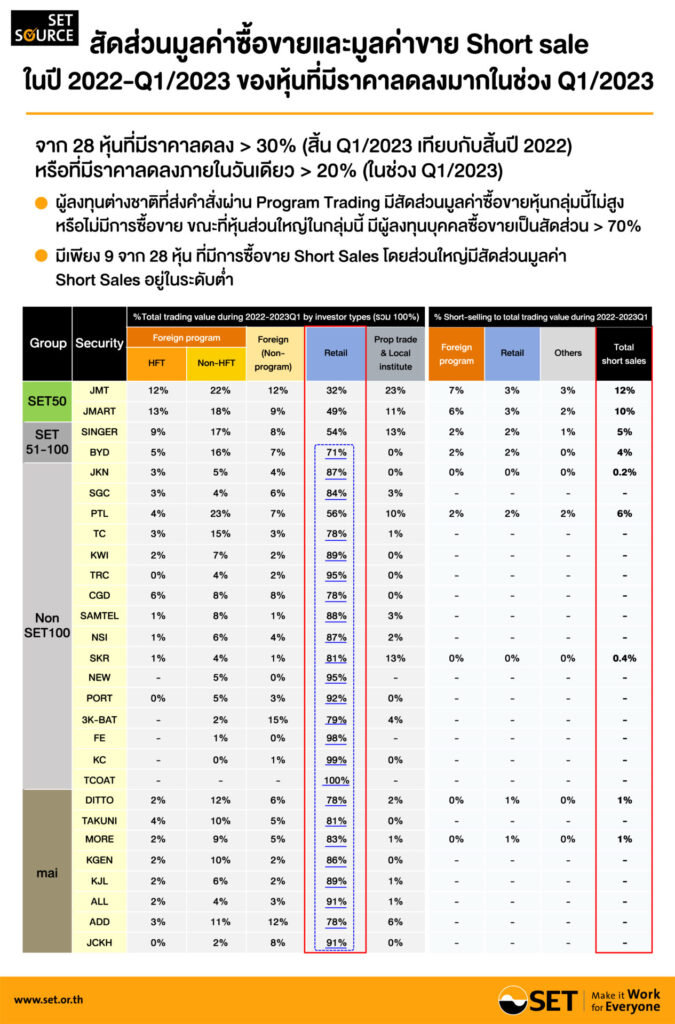 สำหรับประเด็นข้อสงสัยว่ามีการซื้อขายและทำ Short Sale กดดันราคาหุ้นให้ลดต่ำลงนั้น ในประเด็นนี้หากพิจารณาหุ้นทั้งหมดในตลาดที่มีระดับราคาลดลงมากกว่า 30% ในไตรมาสแรกของปี 2566 หรือมีราคาลดลงภายในวันใดวันหนึ่งมากกว่า 20% ในไตรมาสนี้ พบว่ามีหุ้นที่เข้าข่ายดังกล่าวทั้งหมด 28 หุ้น เป็นกลุ่มหุ้นใน SET50 (2 หุ้น) SET51-100 (2 หุ้น) นอก SET100 (16 หุ้น) และ mai (8 หุ้น) ซึ่งถ้าวิเคราะห์พฤติกรรมการซื้อขายของหุ้นเหล่านี้ในช่วง ปี 2565- ไตรมาส 1/2566 พบประเด็นที่น่าสนใจ ดังนี้