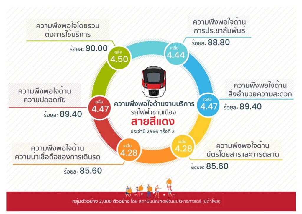 ซึ่งปัจจุบันมีผู้โดยสารมาใช้บริการรถไฟฟ้าสายสีแดงรวมมากกว่า 8 ล้านคน เฉลี่ยอยู่ที่วันละ 2.3 – 2.4 หมื่นคน หากเป็นวันศุกร์ผู้โดยสารจะอยู่ที่ประมาณ 2.5 หมื่นคน อีกทั้งบริษัทฯได้ดำเนินการสำรวจความพึงพอใจจากผู้ใช้บริการ ครั้งที่ 2 ประจำปี 2566 ลงพื้นที่สำรวจโดยสถาบันบัณฑิตพัฒนบริหารศาสตร์(นิด้า) ซึ่งเป็นสถาบันที่มีความเชี่ยวชาญในด้านการสำรวจและวิจัย โดยผลปรากฏว่าจากคะแนนเต็ม 5 ผู้โดยสารมีความพึงพอใจด้านการให้บริการ 4.50, ด้านความปลอดภัย 4.47, ด้านความน่าเชื่อถือต่อความตรงต่อเวลา ความถี่ และคุณภาพในการเดินรถไฟฟ้า 4.28, ด้านการประชาสัมพันธ์และให้ข้อมูล 4.44, ด้านคุณภาพและสิ่งอำนวยความสะดวกบนสถานี และในขบวนรถ 4.47, ด้านเหรียญโดยสาร/บัตรโดยสาร และกิจกรรมส่งเสริมการตลาด 4.28 ซึ่งจากผลสำรวจดังกล่าว แสดงให้เห็นว่าผู้โดยสารมีความเชื่อมั่นต่อการให้บริการรถไฟฟ้าชานเมืองสายสีแดงในด้านต่างๆ เป็นอย่างมาก