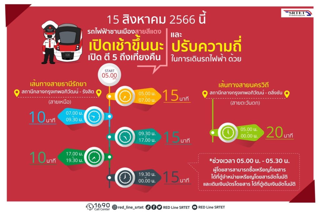 นายสุเทพ พันธุ์เพ็ง กรรมการผู้อำนวยการใหญ่บริษัท รถไฟฟ้า ร.ฟ.ท. จำกัด (รฟฟท.) หรือผู้ให้บริการรถไฟฟ้าชานเมืองสายสีแดง เปิดเผยว่า ตั้งแต่วันที่ 15 สิงหาคม 2566 เป็นต้นไป บริษัทฯจะปรับเวลาเปิดให้บริการเร็วขึ้น จากเดิมเปิดให้บริการในเวลา 05.30 น. เปลี่ยนเป็นเปิดให้บริการในเวลา 05.00 น. เพื่ออำนวยความสะดวกให้แก่ผู้ใช้บริการที่เพิ่มมากขึ้น และสามารถรองรับผู้ที่เดินทางโดยสายการบินต่างๆที่จะเดินทางมาถึงสนามบินดอนเมืองในช่วงเช้ามืด