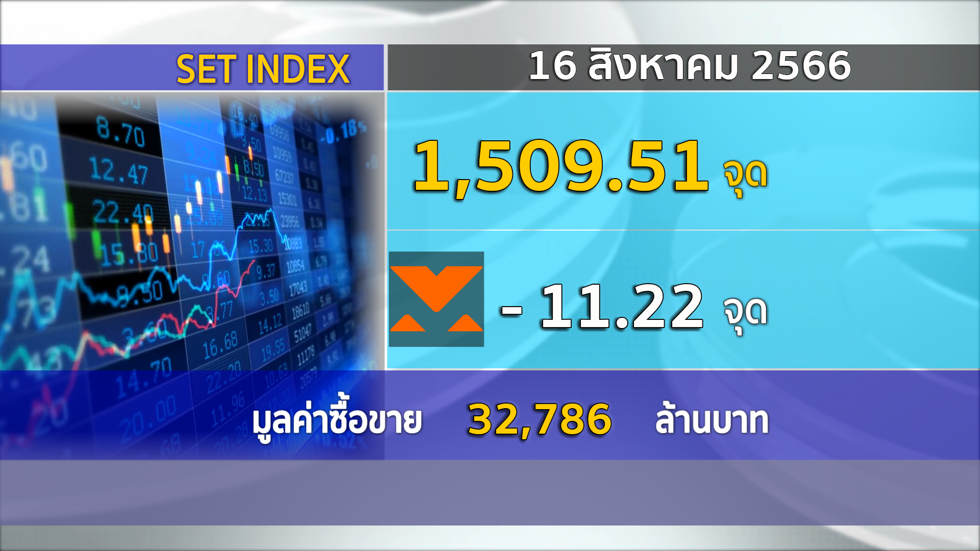 กทม. 16 ส.ค.- SET ปิดภาคเช้าวันนี้ที่ 1,509.51 จุด ลดลง 11.22 จุด (-0.74%) มูลค่าซื้อขายราว 32,786 ล้านบาท