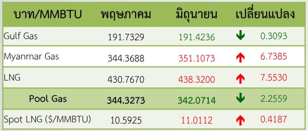 สำหรับสถานการณ์ก๊าซธรรมชาติ (Natural Gas) พบว่า ราคาก๊าซธรรมชาติ (Pool) เดือนมิถุนายน 2566 ปรับตัวลดลงจากเดือนก่อน 2.2559 บาท/ล้านบีทียู มาอยู่ที่ระดับ 342.0714 บาท/ล้านบีทียู จากราคา LNG นำเข้าปรับตัวลดลงส่วนราคา Spot LNG เฉลี่ยเดือนมิถุนายน 2566 นั้น พบว่า ปรับตัวเพิ่มขึ้นจากเดือนก่อน 0.4187 เหรียญสหรัฐฯ/ล้านบีทียู มาอยู่ที่ระดับ 11.0112 เหรียญสหรัฐฯ/ล้านบีทียู เนื่องจากภูมิภาคเอเชียเผชิญกับสภาพอากาศร้อนจัด จึงส่งผลให้เกิดความต้องการใช้ก๊าซธรรมชาติในการผลิตไฟฟ้าเพิ่มขึ้น อย่างไรก็ตาม สภาพอากาศทั่วโลกนั้นเป็นปัจจัยสำคัญในการขับเคลื่อนความต้องการพลังงานในภาคครัวเรือน เช่น ความต้องการใช้ไฟฟ้าในการเปิดเครื่องปรับอากาศในช่วงหน้าร้อน และความต้องการใช้ก๊าซธรรมชาติในช่วงหน้าหนาว