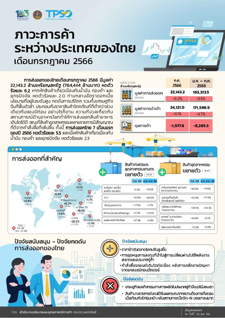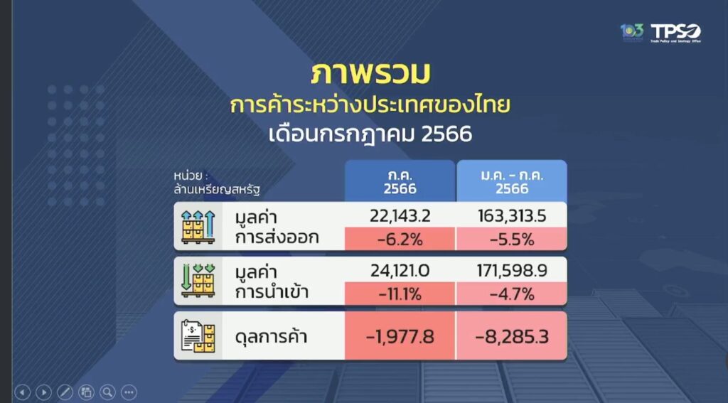 อย่างไรก็ตาม ส่งผลให้ภาพรวมในช่วง 7 เดือนแรก 2566 ( ม.ค.-ก.ค.66 ) การส่งออกไทยมีมูลค่า 163,313.5 ล้านดอลลาร์สหรัฐ ยังคงติดลบที่ 5.5% แต่ยังถือว่าดีกว่าหลายประเทศ เช่น ไต้หวัน สิงคโปร์ อินเดีย และอินโดนีเซียยังคงติดลบมากกว่าไทยทั้งสิ้น