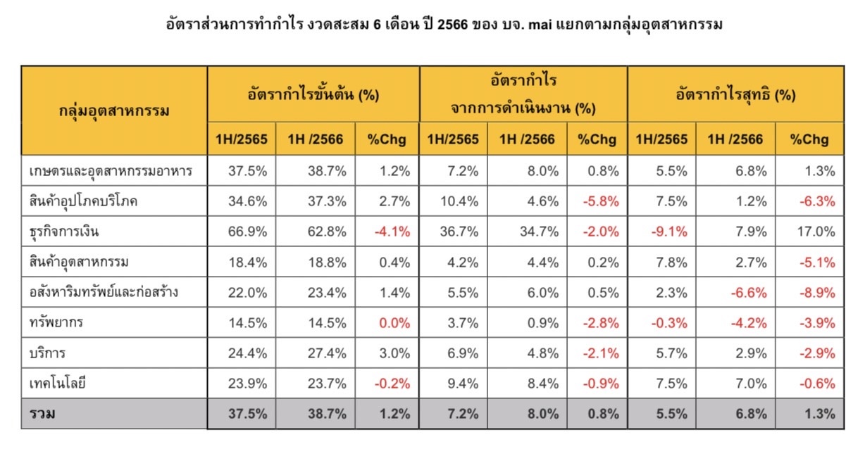 นายประพันธ์ เจริญประวัติ ผู้จัดการตลาดหลักทรัพย์ เอ็ม เอ ไอ (mai) เปิดเผยว่า บริษัทจดทะเบียนใน mai จำนวน 200 บริษัท คิดเป็น 97% จากทั้งหมด 207 บริษัท (ไม่รวมบริษัทในกลุ่มที่เข้าข่ายอาจถูกเพิกถอน หรือ NC และบริษัทที่ปิดงบไม่ตรงงวด) นำส่งผลการดำเนินงาน โดยงวดสะสม 6 เดือน ปี 2566 พบ บจ. รายงานกำไรสุทธิจำนวน 135 บริษัท คิดเป็น 68% ของบริษัทที่นำส่งงบการเงินทั้งหมด