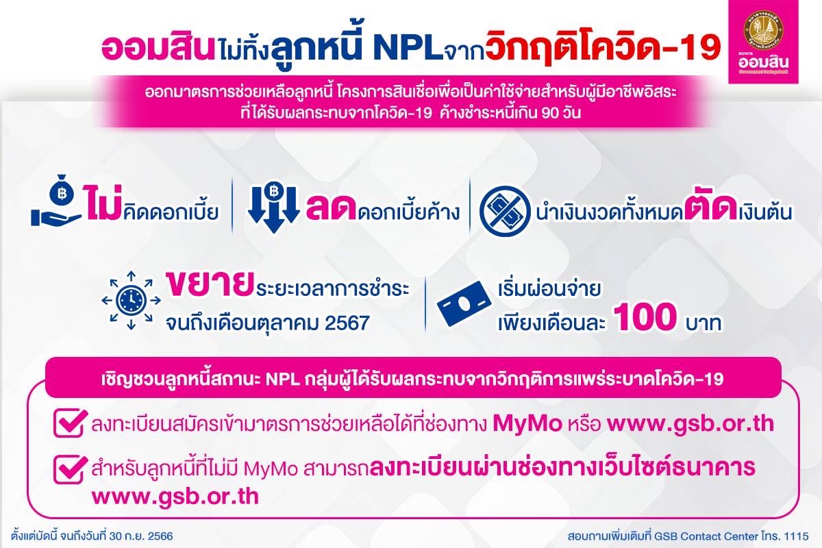 อย่างไรก็ดี เนื่องจากภาวะเศรษฐกิจยังอยู่ในระยะเพิ่งเริ่มฟื้นตัว ประกอบกับค่าครองชีพมีแนวโน้มสูงขึ้น ส่งผลกระทบต่อรายได้และความสามารถในการชำระหนี้ของลูกหนี้ ดังนั้น เพื่อเป็นการช่วยเหลือแก้ไขเครดิตแก่ลูกหนี้ที่ได้รับผลกระทบจากวิกฤติการแพร่ระบาดของโควิด-19 (ลูกหนี้บัญชี 21) ที่มีสถานะเป็น NPL ให้กลับมามีสถานะหนี้ปกติ ธนาคารออมสินจึงออกมาตรการ “ไม่คิดดอกเบี้ย ลดดอกเบี้ยค้างชำระทั้งหมด และนำเงินที่ชำระไปตัดเงินต้นทั้งจำนวน” โดยให้ลูกหนี้เริ่มผ่อนชำระเพียง 100 บาทต่อเดือนสำหรับงวดที่ 1-6 หลังจากนั้นงวดที่ 7-12 ผ่อนชำระ 300 บาทต่อเดือน และขยายระยะเวลาการชำระจนถึงเดือนตุลาคม 2567