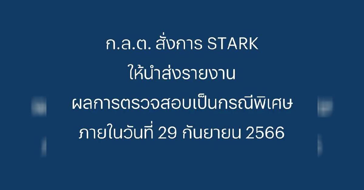 ก.ล.ต. เห็นว่ารายงานผลตรวจสอบดังกล่าวเป็นข้อมูลที่มีความสำคัญที่ต้องนำส่ง ก.ล.ต. และต้องเปิดเผยต่อผู้ถือหลักทรัพย์ของ STARK โดยเร็ว อย่างไรก็ดี ด้วยข้อจำกัดในการรวบรวมเอกสารและใช้เวลาในการขอเอกสาร bank statement เพิ่มเติม เป็นปัจจัยที่อยู่นอกเหนือการควบคุมของ STARK ก.ล.ต. จึงสั่งการให้ STARK นำส่งรายงานผลการตรวจสอบ special audit ภายในวันที่ 29 กันยายน 2566** ตามที่ขอมา แต่เนื่องจากในช่วงที่ผ่านมากรรมการของ STARK ลาออก และได้รับการแต่งตั้งใหม่จำนวนหลายราย ก.ล.ต. จึงกำหนดเงื่อนไขให้ STARK ต้องแสดงข้อมูลเกี่ยวกับกรรมการและกรรมการผู้มีอำนาจลงนามผูกพันบริษัท ซึ่งรวมถึงการแสดงหนังสือรับรองกระทรวงพาณิชย์ที่มีข้อมูลกรรมการและกรรมการผู้มีอำนาจลงนามผูกพันบริษัทที่เป็นปัจจุบันด้วย ทั้งนี้ เมื่อ STARK นำส่งผลการตรวจสอบ special audit แล้วให้เปิดเผยผ่านระบบสารสนเทศของตลาดหลักทรัพย์ไปพร้อมกัน