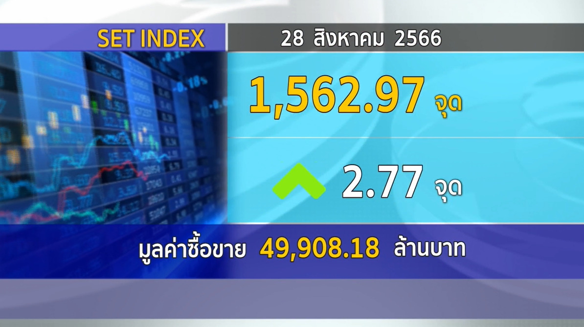 กทม. 28 ส.ค.-SET ปิดวันนี้ที่ 1,562.97 จุด เพิ่มขึ้น 2.77 จุด (+0.18%) มูลค่าซื้อขาย 49,908.18 ล้านบาท