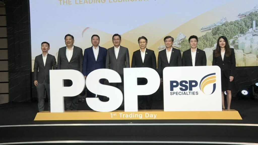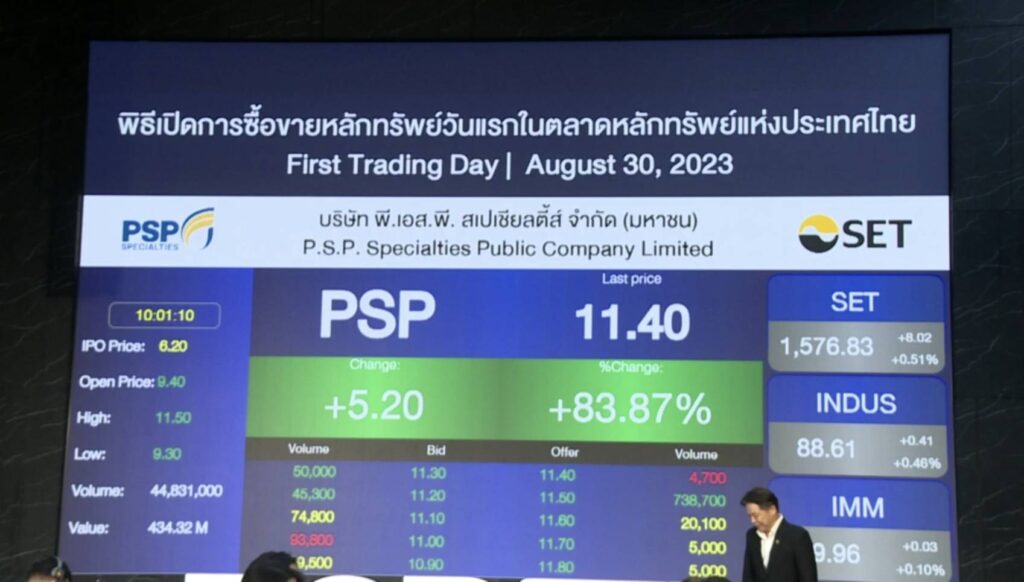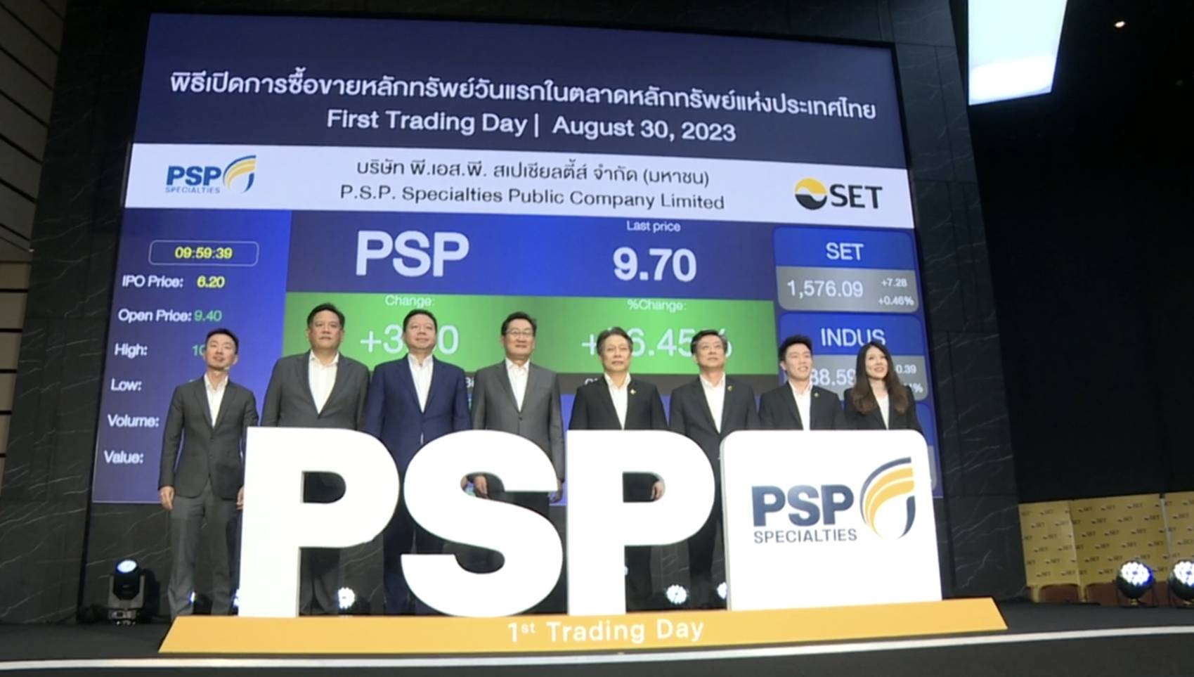 นายภากร ปีตธวัชชัย กรรมการและผู้จัดการตลาดหลักทรัพย์แห่งประเทศไทย (ตลท.) นายแมนพงศ์ เสนาณรงค์ รองผู้จัดการ ตลท. และนายสินธุ์ ครองพาณิชย์ ประธานเจ้าหน้าที่บริหาร บมจ. พี.เอส.พี. สเปเชียลตี้ส์ ร่วมพิธีจดทะเบียนและเริ่มซื้อขายในตลาดหลักทรัพย์ฯ (SET) ของ บมจ. พี.เอส.พี. สเปเชียลตี้ส์ ในวันนี้ (30 ส.ค.) ภายใต้กลุ่มสินค้าอุตสาหกรรม หมวดธุรกิจวัสดุอุตสาหกรรมและเครื่องจักร โดยใช้ชื่อย่อในการซื้อขายหลักทรัพย์ว่า “PSP” เปิดเทรดวันแรกที่ราคา 9.40 บาท เพิ่มขึ้น 3.20 บาท จากราคา IPO ที่ 6.20 บาท หรือเพิ่มขึ้น 52%