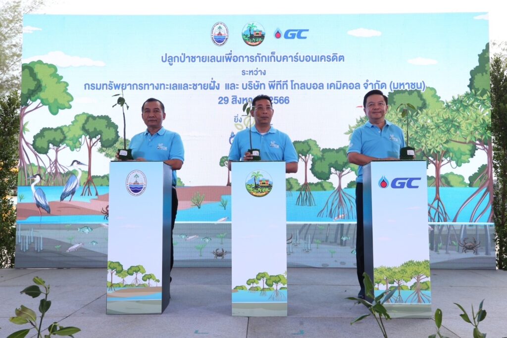 กรุงเทพฯ 31 ส.ค.-กรมทรัพยากรทางทะเลและชายฝั่ง (ทช.) บริษัท พีทีที โกลบอล เคมิคอล จำกัด (มหาชน)(GC) จับมือหน่วยงานภาครัฐจังหวัดระยอง ชุมชนตำบลเนินฆ้อและตำบลทางเกวียน อำเภอแกลง จังหวัดระยอง ร่วมกันจัดกิจกรรมปลูกป่าชายเลน ช่วยกักเก็บคาร์บอนไดออกไซด์ เพื่อเป็นส่วนหนึ่งในการมุ่งสู่เป้าหมาย Net Zero และการปล่อยปูแสม เพื่อส่งเสริมอาชีพ และคุณภาพชีวิตให้กับชุมชนท้องถิ่นระยอง
