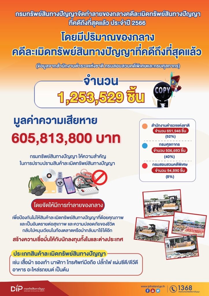 นอกจากนี้ การทําลายของกลางคดีละเมิดทรัพย์สินทางปัญญาที่คดีถึงที่สุดแล้วถือเป็นขั้นตอนสุดท้ายของการแก้ไขปัญหาการละเมิดทรัพย์สินทางปัญญาที่จะต้องดําเนินการอย่างโปร่งใสสอดคล้องกับพันธกรณีภายใต้กรอบองค์การการค้าโลก (WTO) และมีการดำเนินการตามมาตรฐานด้านสิ่งแวดล้อม เพื่อสร้างความเชื่อมั่นให้กับประเทศคู่ค้า นักลงทุน และเจ้าของสิทธิในทรัพย์สินทางปัญญา ว่าสินค้าละเมิดฯ จะไม่กลับเข้าสู่ท้องตลาดอีกต่อไป อีกทั้งยังเป็นการปกป้องผู้บริโภคจากอันตรายที่อาจเกิดจากการใช้สินค้าปลอมที่ไม่ได้มาตรฐาน ในปีนี้ของกลางที่นํามาทําลายมีหลายประเภท เช่น เสื้อผ้า นาฬิกา รองเท้า กระเป๋า เครื่องสําอาง โทรศัพท์มือถือ อะไหล่รถยนต์ สินค้าอาหาร เป็นต้นโดยเป็นของกลางจากการจับกุมและตรวจยึดของสํานักงานตํารวจแห่งชาติ กรมศุลกากร และกรมสอบสวนคดีพิเศษจํานวนรวมทั้งสิ้น 1,253,529 ชิ้น คิดเป็นมูลค่าความเสียหายมากกว่า 600 ล้านบาท หากประชาชนท่านใดพบเห็นการกระทำที่เข้าข่ายละเมิดทรัพย์สินทางปัญญา สามารถแจ้งเบาะแสมายังกองป้องปรามการละเมิดทรัพย์สินทางปัญญา กรมทรัพย์สินทางปัญญา โทร. 02-547-4702 หรือสายด่วน 1368 ได้.-สำนักข่าวไทย