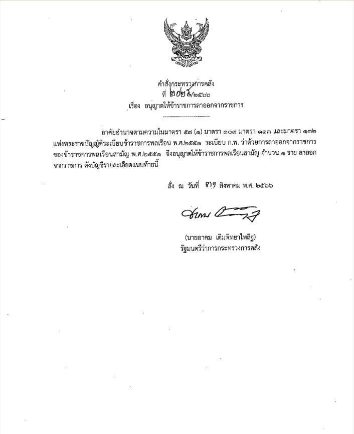 รายงานข่าวจากกระทรวงการคลังแจ้งว่า ในช่วงวันนี้(31 ส.ค.) นายกฤษฎา จีนะวิจารณะ ปลัดกระทรวงการคลัง ได้ยื่นหนังสือลาออกจากตำแหน่ง เพื่อไปดำรงตำแหน่งทางการเมือง โดยนายอาคม เติมพิทยาไพสิฐ รัฐมนตรีว่าการกระทรวงคลัง ได้ลงนามอนุมัติการลาออก มีผลทันที วันนี้ (31 ส.ค.)
