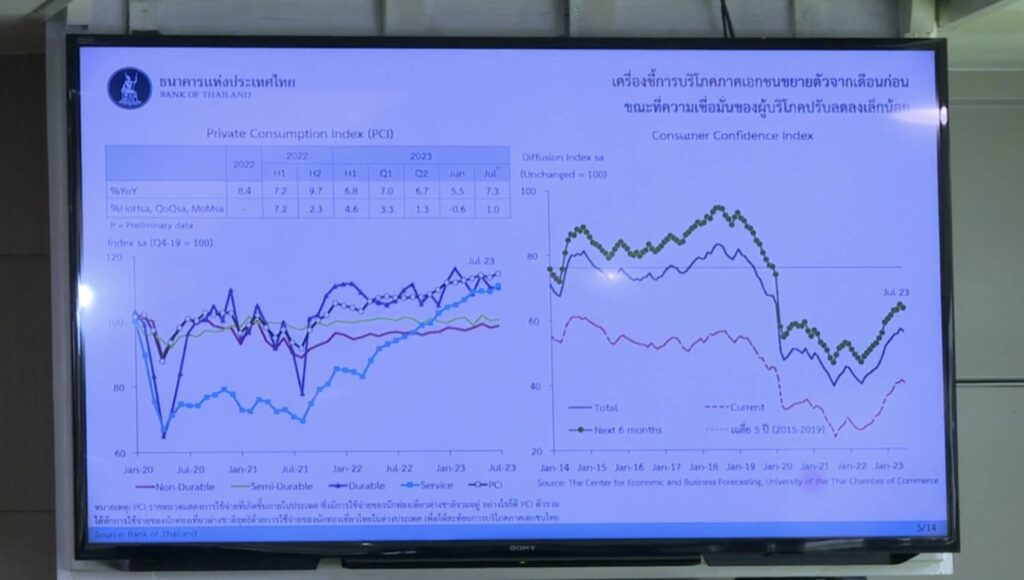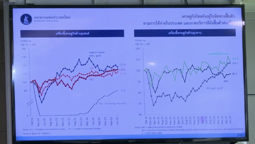 นายสักกะภพ พันธ์ยานุกูล ผู้อำนวยการอาวุโส ฝ่ายเศรษฐกิจมหภาค ธนาคารแห่งประเทศไทย (ธปท.) แถลงภาวะะเศรษฐกิจและการเงินประจำเดือน ก.ค.2566 โดยภาวะเศรษฐกิจไทยยังอยู่ในทิศทางฟื้นตัว การใช้จ่ายในประเทศเพิ่มขึ้นจากทั้งการบริโภคและการลงทุนภาคเอกชน ส่วนหนึ่งการบริโภคได้รับผลดีจากช่วงวันหยุดยาว ทั้งนี้ ปัจจัยสนับสนุนกำลังซื้อภาคครัวเรือนด้านการจ้างงานนอกภาคเกษตรปรับดีขึ้น ขณะที่ความเชื่อมั่นผู้บริโภคปรับลดลงบ้างจากความไม่แน่นอนในการจัดตั้งรัฐบาล ด้านจำนวนนักท่องเที่ยวต่างประเทศที่ขจัดปัจจัยฤดูกาลแล้วยังคงฟื้นตัวต่อเนื่อง โดยเฉพาะนักท่องเที่ยวรัสเซียที่มีการเพิ่มจำนวนเที่ยวบินระหว่างรัสเซียและไทยมากขึ้น ส่วนนักท่องเที่ยวบางสัญชาติ อาทิ ออสเตรเลีย สิงค์โปร และยุโรป ปรับลดลงเล็กน้อย ขณะที่การใช้จ่ายภาครัฐขยายตัวจากรายจ่ายลงทุนด้านคมนาคม