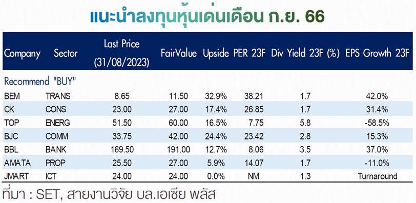 ในมุมผลประกอบการ ฝ่ายวิจัยฯ ปรับลดประมาณการกำไรปี 2566 ลงจาก 1.12 แสนล้านบาท เหลือ 1.09 แสนล้านบาท คิดเป็น EPS66F จาก 91.8 บาท/หุ้น เหลือ 88.6 บาท/หุ้น ประเมินเป้าหมาย SET INDEX ปี 2566 โดยอิง MEYG ที่ระดับ 3.5% จะได้ดัชนีเป้าหมายปี 2566 ที่ 1541 จุด แต่ถ้าอิง MEYG 3.3% (มูลค่าซื้อขายกลับมาสูงกว่า 6 หมื่นล้านบาท/วัน) จะได้ดัชนีเป้าหมายปี 2566 ที่ 1595 จุด ในส่วนของ Fund Flow มีโอกาสกลับมาไหลเข้าในช่วงที่เหลือของปี หลังตลาดหุ้นไทยผ่านการปรับฐานลงมาพอสมควร และผ่านช่วงสุญญากาศทางการเมืองเป็นที่เรียบร้อยแล้ว พร้อมคาดหวังการฟื้นตัวของเศรษฐกิจในช่วง 2H66 ขณะที่กลุ่มหุ้นที่มีโอกาส Outperform ได้ คือ กลุ่มหุ้นที่มีกำไรเติบโตเด่นในช่วง 2H66 คือ PETRO, MEDIA, STEEL, FOOD, INSUR, TRANS, PKG, PROP, และ COMM เป็นต้น