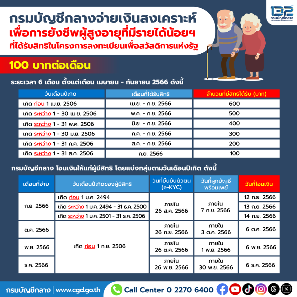 นางสาวทิวาพร ผาสุข รองอธิบดีกรมบัญชีกลาง ในฐานะโฆษกกรมบัญชีกลางเปิดเผยว่า คณะกรรมการบริหารกองทุนผู้สูงอายุ อนุมัติแนวทางการจ่ายเงินสงเคราะห์เพื่อการยังชีพแก่ผู้สูงอายุที่มีรายได้น้อย ผู้มีสิทธิในโครงการลงทะเบียนเพื่อสวัสดิการแห่งรัฐปี 2565 ในปีงบประมาณ 2566 ในอัตรา 100 บาทต่อเดือน ระยะเวลา 6 เดือนตั้งแต่เดือนเมษายน – เดือนกันยายน 2566 ดังนี้ “ผู้มีสิทธิที่ยังไม่ได้ยืนยันตัวตน (e-KYC) สามารถไปยืนยันตัวตนได้ที่ธนาคารกรุงไทยทุกสาขา