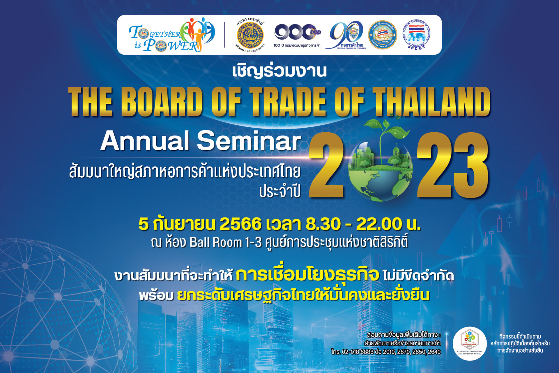 นายสนั่น อังอุบลกุล ประธานกรรมการหอการค้าไทยและสภาหอการค้าแห่งประเทศไทย เปิดเผยว่าสภาหอการค้าฯผนึกกำลังร่วมกับ กระทรวงพาณิชย์ สมาคมการค้า และหอการค้าต่างประเทศในประเทศไทย จัดงานสัมมนาใหญ่สภาหอการค้าแห่งประเทศไทย ประจำปี 2023 ภายใต้ธีม Connect Competitive Sustainable ในวันที่ 5 กันยายน2566 ณ ศูนย์การประชุมแห่งชาติสิริกิติ์ เพื่อเป็นส่วนหนึ่งของการเฉลิมฉลองครบรอบ 90 ปี หอการค้าไทย
