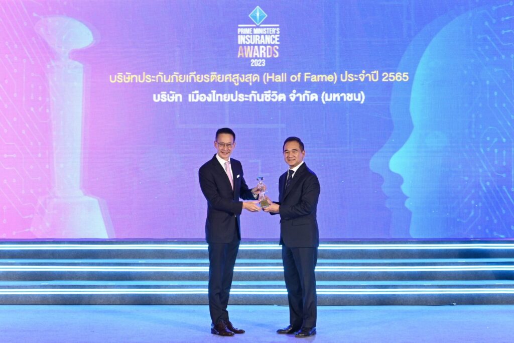 โดย “รางวัลบริษัทประกันภัยเกียรติยศสูงสุด (Hall of Fame)” ประจำปี 2565 ต่อเนื่องเป็นปีที่ 3 นี้ ถือเป็นที่สุดแห่งความภาคภูมิใจ เพราะเป็นรางวัลสูงที่สุดในอุตสาหกรรมประกันภัย ที่สำนักงาน คปภ. มอบให้แก่บริษัทที่มีผลงานการบริหารดีเด่นและมีความแข็งแกร่งรอบด้าน ซึ่งเมืองไทยประกันชีวิตเป็นบริษัทเพียงแห่งเดียวที่สามารถคว้ารางวัลนี้มาได้ จากความโดดเด่นด้านการบริหารงานในทุกมิติ ที่มุ่งมั่นตอบสนองความต้องการที่แท้จริงของลูกค้าพร้อมมีการพัฒนาผลิตภัณฑ์ด้านประกันชีวิต ความคุ้มครองสุขภาพ และบริการด้านต่าง ๆ ตลอดจนช่องทางจำหน่ายที่หลากหลาย รวมถึงนวัตกรรมและเทคโนโลยีสมัยใหม่ พร้อมการพัฒนาบุคลากรอย่างต่อเนื่อง อีกทั้งยังเป็นองค์กรที่โดดเด่นด้วยการดำเนินธุรกิจอย่างยั่งยืน เดินหน้าควบคู่ไปกับความรับผิดชอบในด้านการจัดการด้านสิ่งแวดล้อม(Environment) การจัดการด้านสังคม (Social) และการจัดการด้านธรรมาภิบาล (Governance) หรือ ESG จนทำให้ได้รับรางวัลเกียรติคุณบริษัทประกันภัยดีเด่น รางวัลเกียรติยศบริษัทประกันชีวิตที่มีการบริหารงานดีเด่น ติดต่อกัน 4 ครั้ง และรางวัลบริษัทประกันชีวิตที่มีการบริหารงานดีเด่น อันดับที่ 1 ต่อเนื่อง 17 ปีซ้อน ซึ่งถือเป็นบริษัทที่มีผลงานด้านการบริหารงานที่โดดเด่นสูงสุดในอุตสาหกรรมประกันภัย