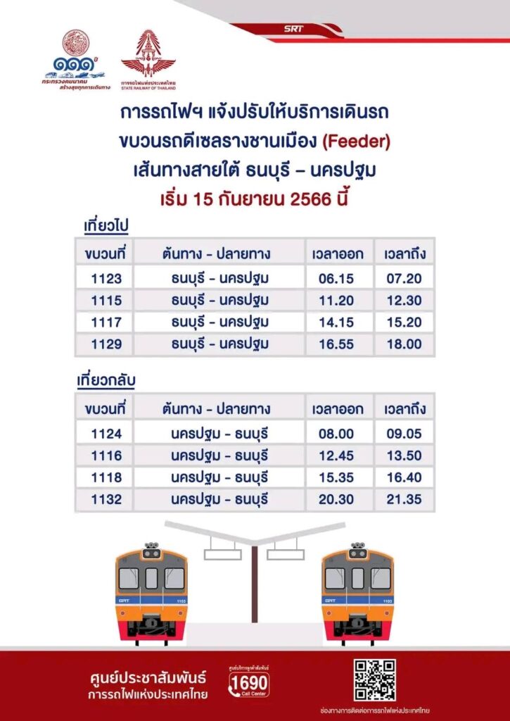 ปัจจุบันพบว่า สถิติผู้ใช้บริการเดินทางโดยขบวนรถดีเซลรางชานเมือง (Feeder) เส้นทางสายใต้ ธนบุรี-นครปฐม มีจำนวนลดลง เหลือประมาณวันละ 850 คน หรือเฉลี่ยขบวนละ 42 คน ดังนั้น การรถไฟฯ จึงได้พิจารณาปรับเปลี่ยนจำนวนเที่ยวที่ให้บริการ พร้อมทั้งปรับเวลาของขบวนรถใหม่ เพื่อให้เหมาะสมและสอดคล้องกับสถานการณ์การเดินทางของผู้ใช้บริการในปัจจุบัน เป็น 8 ขบวน/วัน ซึ่งเริ่มตั้งแต่วันที่ 15 กันยายน 2566 เป็นต้นไป ประกอบด้วย
