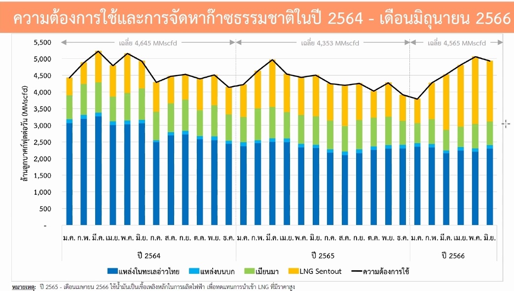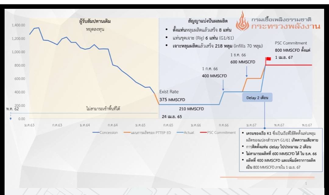 นายศุภลักษณ์ พาฬอนุรักษ์ รองอธิบดีกรมเชื้อเพลิงธรรมชาติ กล่าวว่า กรมฯ ได้ประสานทุกฝ่าย เพื่อเร่งกำลังผลิตทดแทนแหล่งเอราวัณ หรือ G1/61 ที่เดิมคาดว่า วันที่ 1 ธ.ค.66 กำลังผลิตจะเพิ่มเป็น 600 ล้านลูกบาศก์ฟุตต่อวัน จากปัจจุบันนี้ผลิตได้ 400 ล้านลูกบาศก์ฟุตต่อวัน แต่ล่าสุดของผู้ดำเนินการผลิต คือ บมจ.ปตท.สำรวจและผลิตปิโตรเลียม (ปตท.สผ.) ไม่สามารถดำเนินการได้ เนื่องจากเครนของเรือ K1 ที่ใช้ติดตั้งแท่นหลุมผลิตแปลงสำรวจเกิดร้าวเสียหาย ต้องเปลี่ยนเรือใหม่ ทำให้การผลิตล่าช้าไปอย่างน้อย 2 เดือน แต่บริษัทให้ความมั่นใจว่าจะเพิ่มกำลังผลิตให้เป็นไปตามสัญญาระบบแบ่งปันผลผลิต ที่ 800 ล้านลูกบาศก์ฟุตต่อวัน ภายในวันที่ 1 เม.ย.67