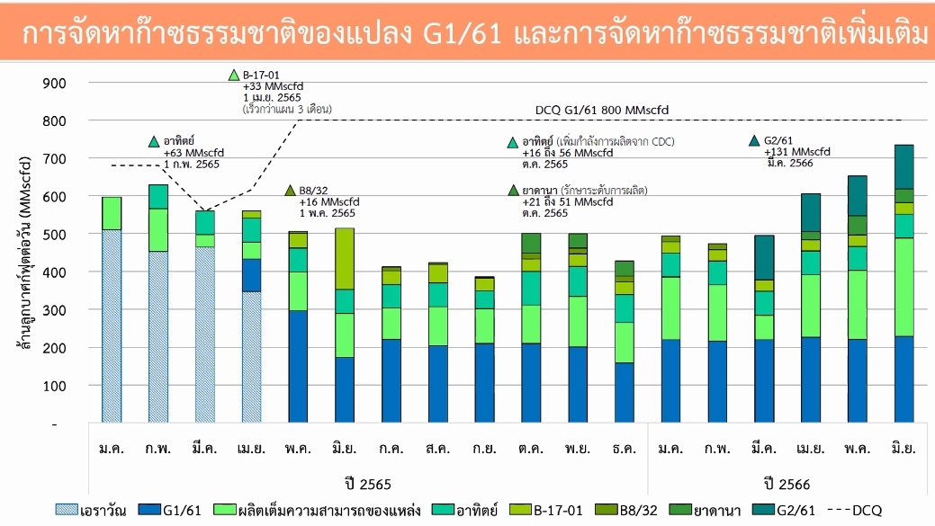 ดังนั้น กรมฯ จึงเร่งประสานงานกับทุกภาคส่วนเร่งแก้ไขปัญหา โดย ปตท.สผ.ได้เพิ่มกำลังผลิตในแหล่งจี 2/61 หรือบงกช อย่างต่อเนื่องอีก 130 ล้านลูกบาศก์ฟุตต่อวัน จากที่มีสัญญาผลิต 700 ล้านลูกบาศก์ฟุตต่อวัน ไม่มีการหรี่หรือปรับลดกำลังผลิตแหล่งอาทิตย์ โดยผลิตเพิ่มอีก 60 ล้านลูกบาศก์ฟุตต่อวัน มีการประสานงานแหล่งยาดานา จากเมียนมา ขอความร่วมมือให้คงกำลังผลิตที่ 350 ล้านลูกบาศก์ฟุตต่อวัน ให้นานที่สุด และประสานมาเลเซียขอให้ก๊าซจากแหล่งพัฒนาพื้นที่ร่วม เจดีเอ มาใช้ในไทย ในกรณีที่มาเลเซียไม่มีความจำเป็นต้องใช้ ภาพรวมในขณะนี้บริหารจัดการแหล่งก๊าซฯ ทางท่อ ทดแทนการนำเข้าก๊าซธรรมชาติเหลว (แอลเอ็นจี) ซึ่งจะช่วยทำให้ไม่เพิ่มภาระต่อต้นทุนค่าไฟฟ้า