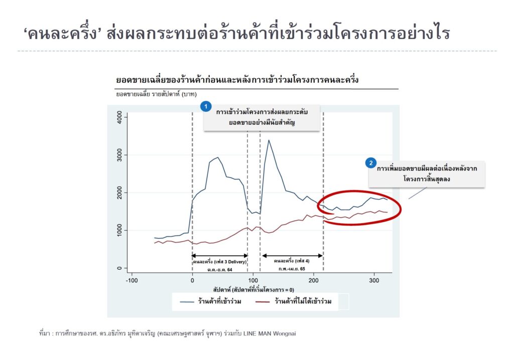 รศ.ดร.อธิภัทรได้ร่วมกับ LINE MAN Wongnai ในการทำวิจัยเรื่อง Digital Fiscal Stimulus, SMEs, and the Consumer: Insights from Thailand’s Half and Half program เพื่อศึกษาผลกระทบของโครงการคนละครึ่งต่อพฤติกรรมของร้านค้าและผู้บริโภค ผลการวิจัยชี้ว่า ร้านค้าที่เข้าร่วมโครงการมียอดขายเพิ่มขึ้นอย่างก้าวกระโดดเมื่อเปรียบเทียบกับร้านค้าที่ไม่เข้าร่วม โดยกลไกหลักของโครงการคนละครึ่งคือ การขยายฐานลูกค้าให้แก่ร้านที่เข้าร่วมโครงการ นอกจากนี้ อีกข้อค้นพบที่สำคัญคือ แม้จะจบโครงการไปแล้ว แต่ยอดขายของร้านค้าที่เข้าร่วมยังคงเพิ่มขึ้นเมื่อเปรียบเทียบกับก่อนเข้าโครงการ เพราะร้านค้าเป็นที่รู้จักมากขึ้น ได้ฐานลูกค้าที่กว้างขึ้น