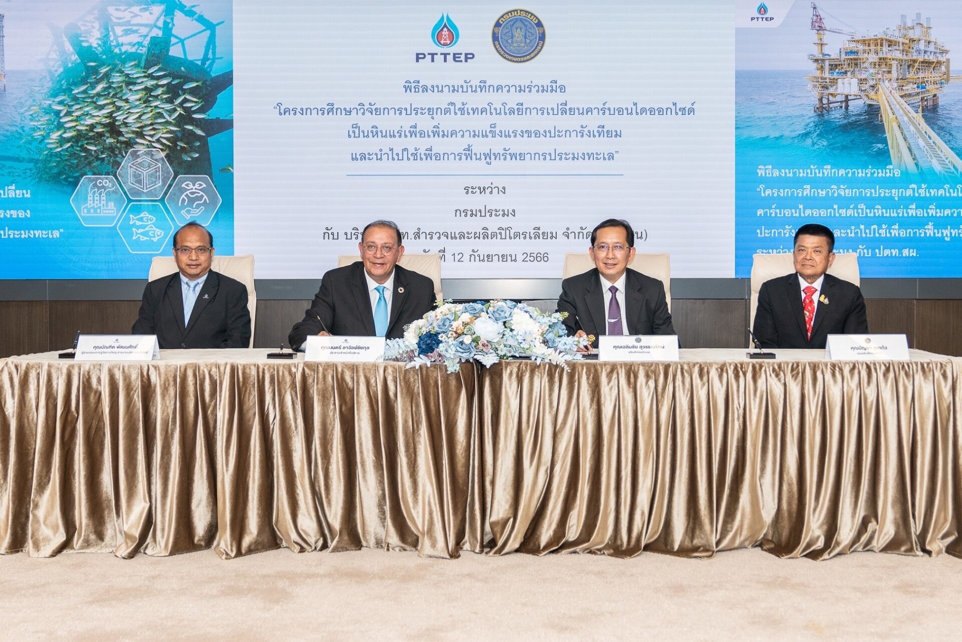 กรมประมง โดยนายเฉลิมชัย สุวรรณรักษ์ อธิบดีกรมประมง และบริษัทปตท.สำรวจและผลิตปิโตรเลียม จำกัด(มหาชน) หรือ ปตท.สผ. โดยนายมนตรี ลาวัลย์ชัยกุล ประธานเจ้าหน้าที่บริหารร่วมลงนามบันทึกข้อตกลงความร่วมมือ (MOU) ในโครงการศึกษาวิจัยการประยุกต์ใช้เทคโนโลยีการเปลี่ยนคาร์บอนไดออกไซด์เป็นหินแร่ เพื่อเพิ่มความแข็งแรงของปะการังเทียม และนำไปใช้เพื่อการฟื้นฟูทรัพยากรประมงทะเล มีวัตถุประสงค์เพื่อพัฒนาเทคโนโลยีที่จะเปลี่ยนก๊าซคาร์บอนไดออกไซด์และนำมาใช้ประโยชน์ในการบริหารจัดการทรัพยากรสัตว์น้ำเพื่อการประมง ฟื้นฟูและพัฒนาแหล่งอาศัยของสัตว์ทะเลให้มีความอุดมสมบูรณ์ ช่วยรักษาสมดุลของระบบนิเวศ รวมถึง เพื่อส่งเสริมการพัฒนาองค์ความรู้ของประเทศในด้านวิทยาศาสตร์และเทคโนโลยี รวมทั้งช่วยลดปัญหาสภาวะโลกร้อนไปพร้อมกัน