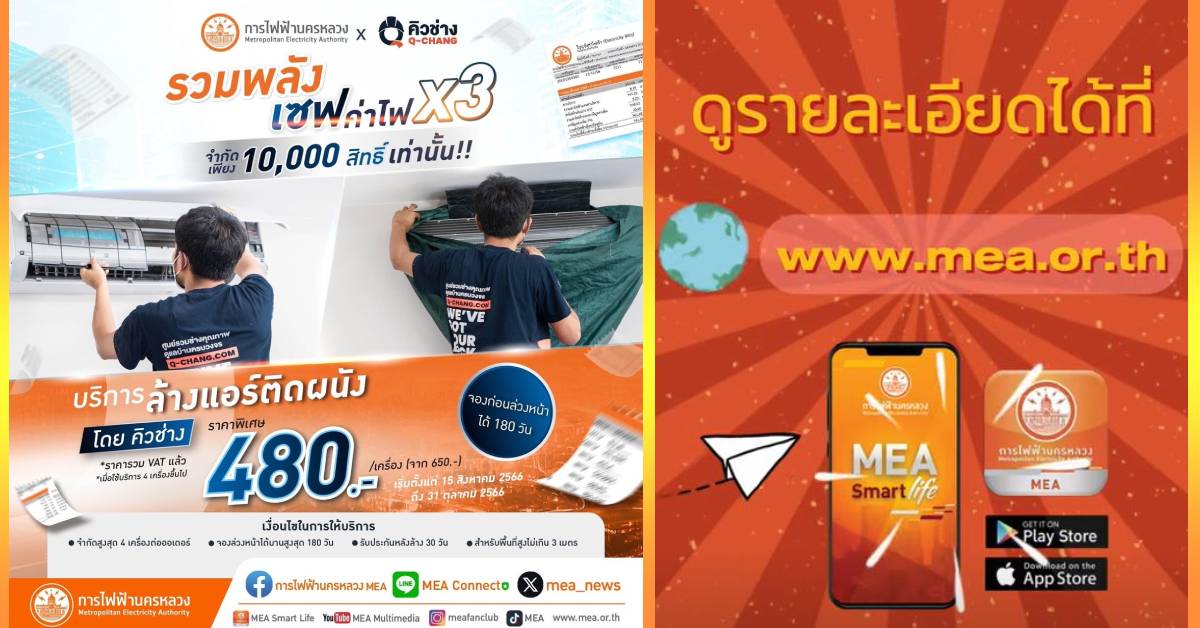 📣ข่าวดี! MEA x Q-CHANG (คิวช่าง) “รวมพลัง เซฟค่าไฟ X3” มอบส่วนลดล้างแอร์ราคาพิเศษ 10,000 สิทธิ์ต่อเดือน สำหรับผู้ใช้ไฟฟ้า MEA ที่อยู่ในจังหวัดกรุงเทพมหานคร นนทบุรี และสมุทรปราการ ลงทะเบียนรับโค้ดส่วนลดได้ที่ https://bit.ly/MXQair