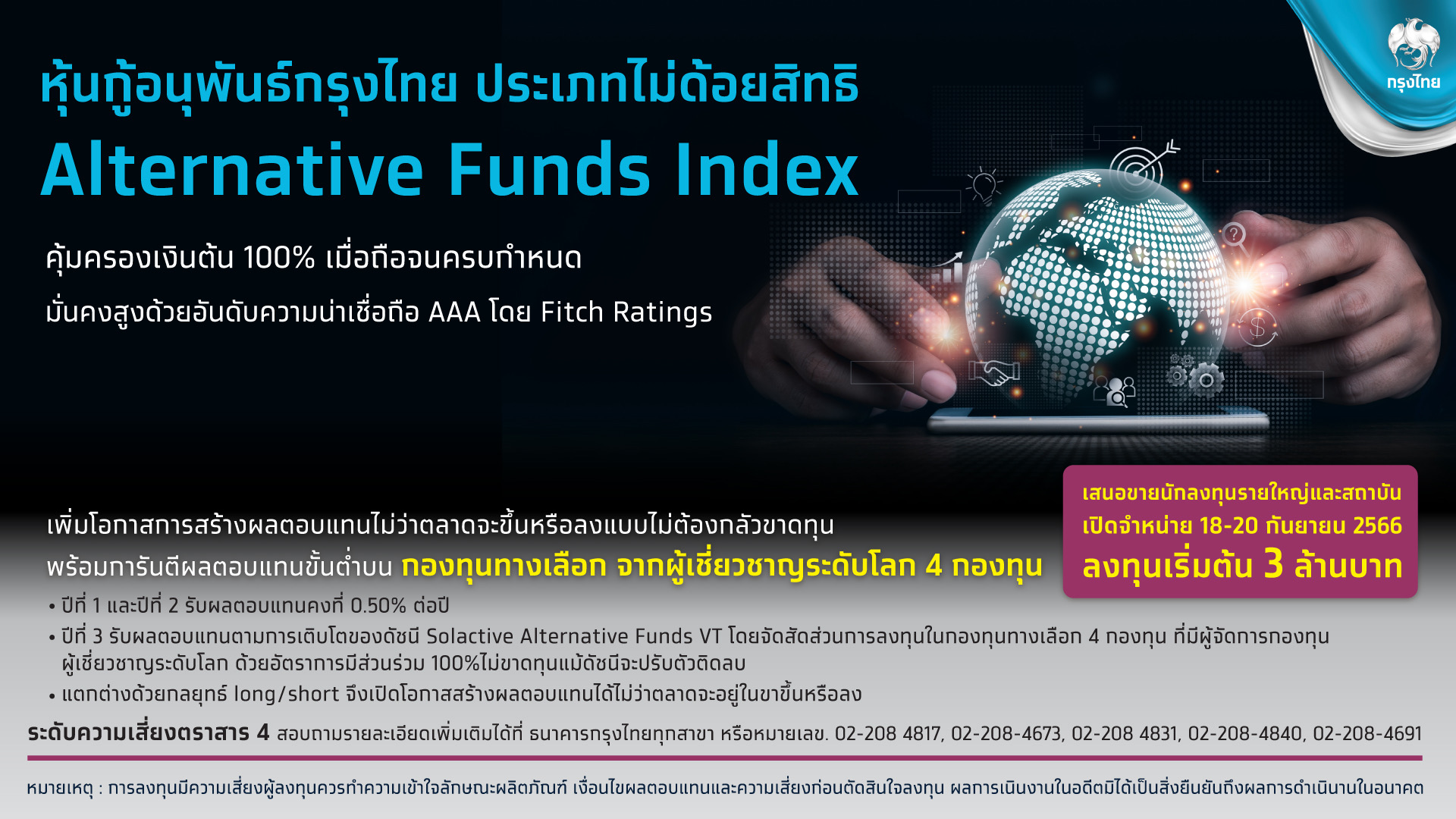 กรุงเทพฯ 13 ก.ย.-ธนาคารกรุงไทย เสนอขายหุ้นกู้อนุพันธ์ Alternative Funds Index อายุ 3 ปี อ้างอิงดัชนีSolactive Alternative Funds VT ชูจุดเด่นคุ้มครองเงินต้น 100% เสนอขายผู้ลงทุนสถาบันและผู้ลงทุนรายใหญ่ลงทุนขั้นต่ำ 3 ล้านบาท