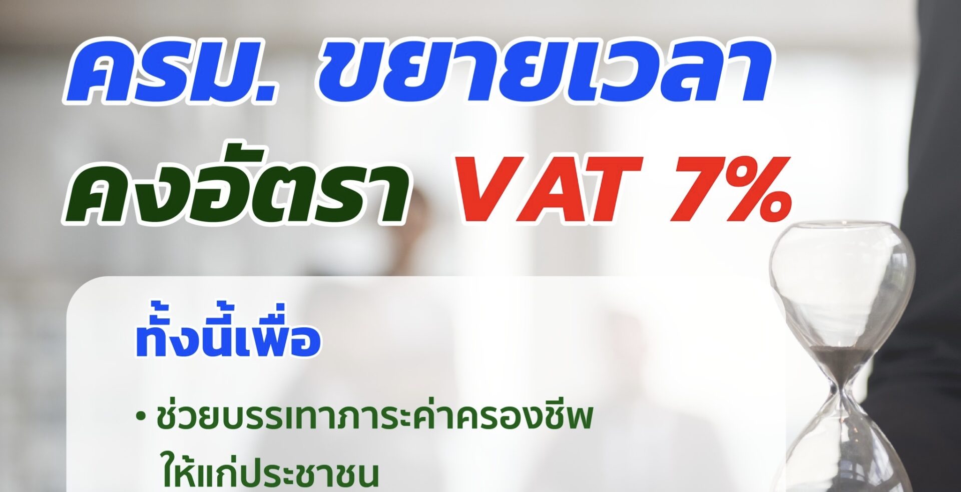 ผู้สื่อข่าวรายงานว่า ที่ประชุมคณะรัฐมนตรี เห็นชอบขยายระยะเวลาการลดอัตราภาษีมูลค่าเพิ่มเหลือ 7% ออกไปอีก 1 ปี สำหรับการขายสินค้า การให้บริการ หรือการนำเข้าทุกกรณี ตั้งแต่วันที่ 1 ตุลาคม 2566 ถึงวันที่ 30 กันยายน 2567 เพื่อสนับสนุนการฟื้นตัวของการใช้จ่ายเพื่อการอุปโภคบริโภคและการลงทุนภาคเอกชนภายในประเทศ รวมทั้งสร้างความเชื่อมั่นให้แก่ภาคธุรกิจ อันจะทำให้เศรษฐกิจไทยสามารถขยายตัวได้ตามเป้าหมายที่คาดการณ์ไว้ อันจะนำไปสู่ความมั่นคงทางเศรษฐกิจของประเทศต่อไป