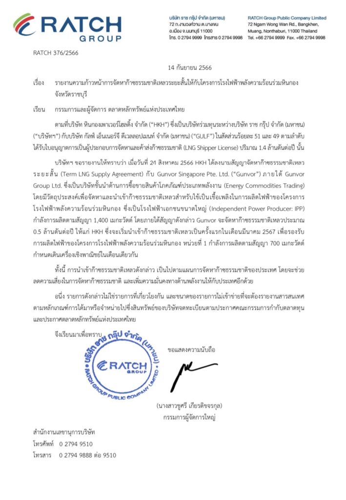 บมจ.ราช กรุ๊ป (RATCH) แจ้งว่า เมื่อวันที่ 24 สิงหาคม 2566 บริษัท หินกองเพาเวอร์โฮลดิ้ง จำกัด (HKH)ได้ลงนามสัญญาจัดหาก๊าซธรรมชาติเหลวระยะสั้น (Term LNG Supply Agreement) กับ Gunvor Singapore Pte.Ltd ภายใต้ Gunvor Group Ltd. ซึ่งเป็นบริษัทชั้นนำด้านการซื้อขายสินค้าโภคภัณฑ์ประเภทพลังงาน (Energy Commodities Trading) โดยมีวัตถุประสงค์เพื่อจัดหาและนำเข้าก๊าซธรรมชาติเหลวสำหรับใช้เป็นเชื้อเพลิงในการผลิตไฟฟ้าของโครงการโรงไฟฟ้าพลังความร้อนร่วมหินกองซึ่งเป็นโรงไฟฟ้าเอกชนขนาดใหญ่ (IPP) กำลังการผลิตตามสัญญา 1,400 เมกะวัตต์