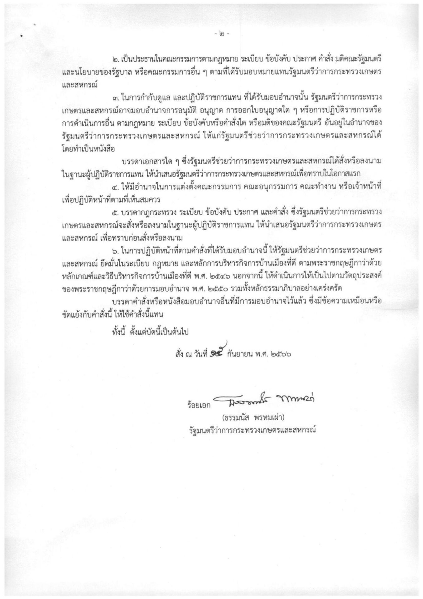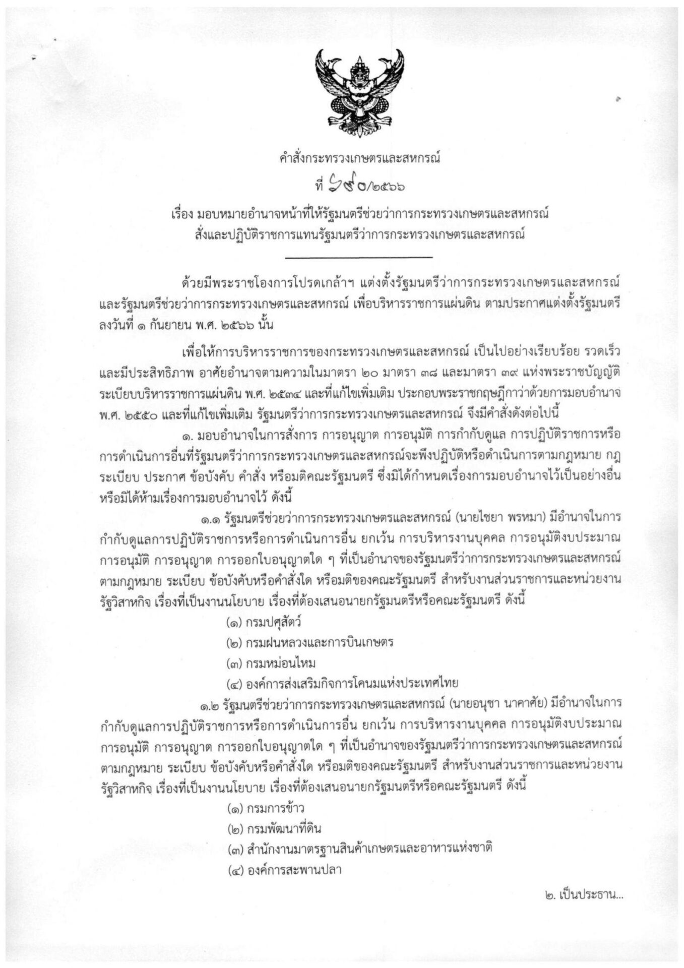 ร.อ.ธรรมนัส พรหมเผ่า รัฐมนตรีว่าการกระทรวงเกษตรและสหกรณ์ ได้ลงนามในคำสั่งกระทรวงเกษตรฯ ที่ 690/2566 ในวันนี้ (15 กันยายน 2566) เรื่อง มอบหมายอำนาจหน้าที่ให้รัฐมนตรีช่วยว่าการกระทรวงเกษตรและสหกรณ์ สั่งและปฏิบัติราชการแทนรัฐมนตรีว่าการกระทรวงเกษตรและสหกรณ์