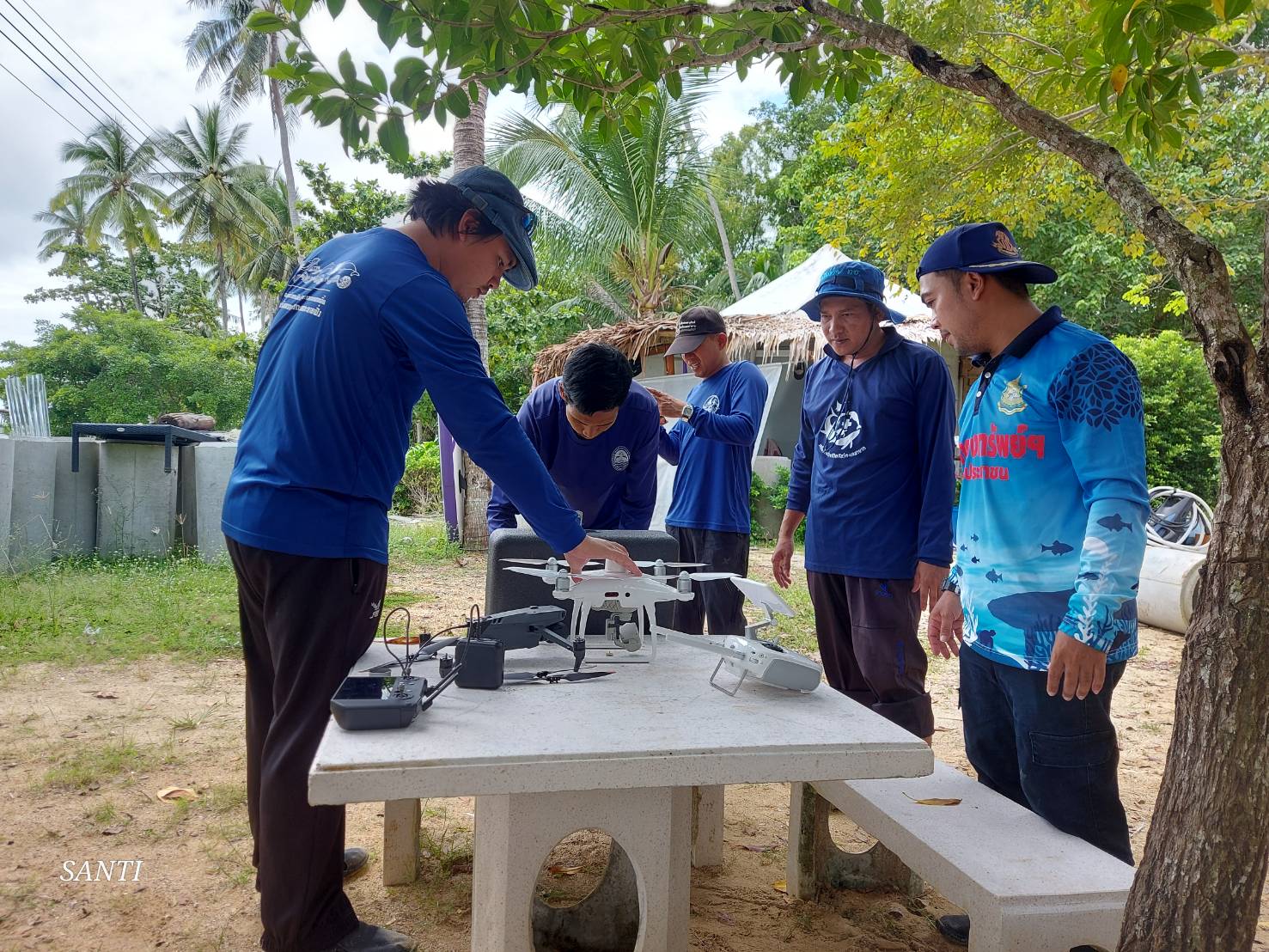 จากนั้น เจ้าหน้าที่ ศวอล. ได้นำเรือขนาด 23 ฟุต ไปยังเกาะมุกด์เพื่อสำรวจ ติดตาม และเฝ้าระวังการเกยตื้นซ้ำของลูกพะยูนตัวดังกล่าว โดยใช้อากาศยานไร้คนขับ (UAV) แบบ Multi-rotor จำนวน 2 เครื่อง บริเวณหน้าเกาะมุกด์ใกล้กับจุดที่พบการเกยตื้น จากผลการสำรวจพบพะยูนอยู่รวมกัน 1 ฝูง จำนวน 6 ตัว โดยมีพะยูนโตเต็มวัย 4 ตัว ลูกพะยูน 2 ตัว และพบว่า ลูกพะยูนตัวดังกล่าวกลับสู่ฝูงได้สำเร็จ ทั้งนี้ เจ้าหน้าที่ ศวอล. ได้เฝ้าระวังการกลับมาเกยตื้นซ้ำของลูกพะยูนตัวดังกล่าวในพื้นที่ต่อไป
