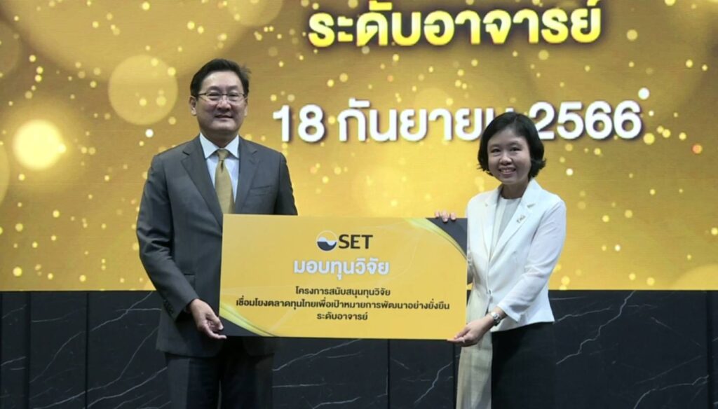 นอกจากนี้ได้สนับสนุนทุนวิจัยที่ให้แก่อาจารย์ที่จะทำงานวิจัยที่เชื่อมโยงและตลาดทุนไทยเพื่อเป้าหมายการพัฒนาอย่างยั่งยืน รวม 10 ทุน และมอบ 8 รางวัลให้แก่นิสิต นักศึกษา ที่ผลิตงานวิจัยที่ผ่านเข้ารอบสุดท้ายในโครงการสนับสนุนทุนวิจัยด้านตลาดทุน ประจำปี 2566 ด้วย