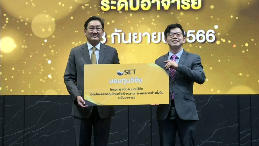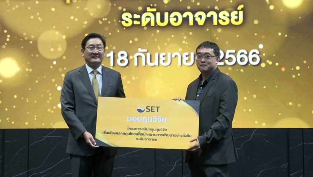 ปีนี้ตลาดหลักทรัพย์ฯ ได้สนับสนุนการทำงานวิจัยในระดับอาจารย์ ใน “โครงการสนับสนุนทุนวิจัย : เชื่อมโยงตลาดทุนไทยเพื่อเป้าหมายการพัฒนาอย่างยั่งยืน” เพื่อสนับสนุนอาจารย์ไทยจากมหาวิทยาลัยในประเทศและต่างประเทศ ร่วมพัฒนางานวิจัยด้านการพัฒนาอย่างยั่งยืน ซึ่งผลงานวิจัยที่ได้ผ่านการคัดเลือกและได้รับการสนับสนุนทุนวิจัยในครั้งนี้ มีมุมมองครบทั้ง 3 ด้านในการพัฒนาเพื่อความอย่างยั่งยืน ทั้งด้านสิ่งแวดล้อม (E) สังคม (S) และบรรษัทภิบาล (G) จำนวนทั้งสิ้น 10 ผลงานวิจัย ซึ่งคาดว่าผลงานเหล่านี้จะสามารถนำมาถ่ายทอดให้ผู้มีส่วนเกี่ยวข้องได้ร่วมรับฟังในงานสัมมนาใหญ่ด้านงานวิจัยตลาดทุนที่จะจัดขึ้นในโอกาสก้าวสู่ปีที่ 50 ตลาดหลักทรัพย์ฯ ในปี 2567 ด้วย