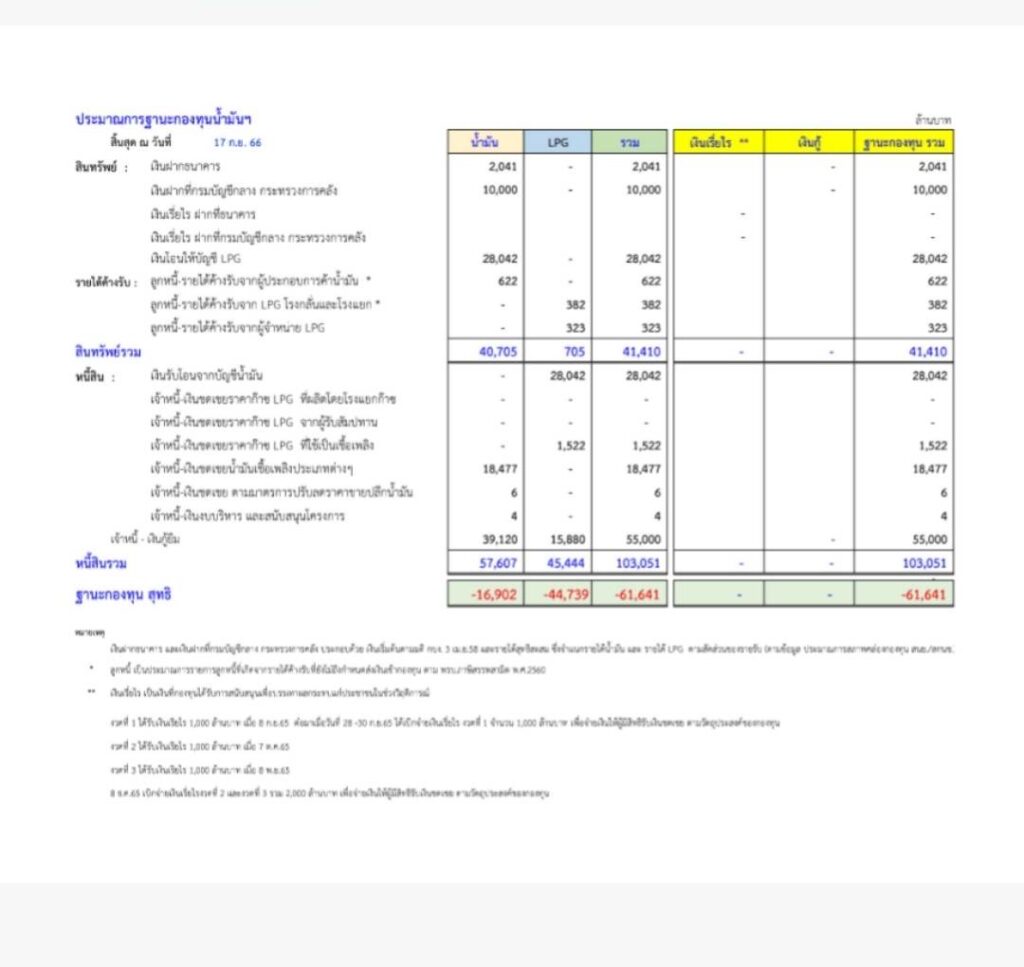 โดยปัจจุบัน (ณ วันที่ 19 ก.ย.) กองทุนน้ำมันฯมีการอุดหนุนราคาดีเซลอยู่ที่ลิตรละ8.98 บาทซึ่งถือเป็นอัตราการอุดหนุนที่ทำสถิติสูงสุดเป็นประวัติการณ์เนื่องจากราคาดีเซลตลาดโลกมีการปรับตัวเพิ่มขึ้นสูงต่อเนื่อง และทำให้ฐานะกองทุนน้ำมัน ณ วันที่ 17 ก.ย. 66 ติดลบอยู่ที่ 61,641 ล้านบาท แบ่งเป็นบัญชีน้ำมันติดลบ 16,902 ล้านบาทและบัญชีก๊าซปิโตรเลียมเหลวหรือLPG ติดลบ 44,739 ล้านบาท