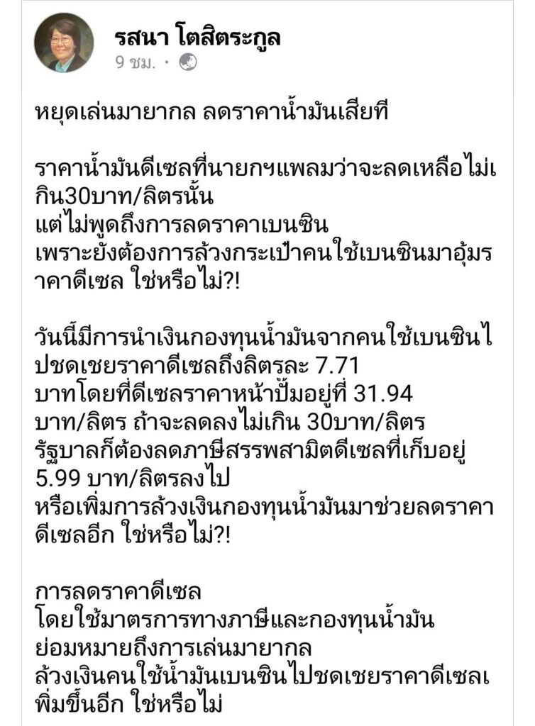 “ลดราคาดีเซล โดยใช้มาตรการทางภาษีและกองทุนน้ำมัน ย่อมหมายถึงการเล่นมายากล ล้วงเงินคนใช้น้ำมันเบนซินไปชดเชยราคาดีเซลเพิ่มขึ้นอีก ใช่หรือไม่และรมว.พลังงานประกาศว่าจะลดราคาเบนซินให้เฉพาะกลุ่มพิเศษที่ต้องใช้เบนซินในการประกอบอาชีพ ซึ่งเป็นคำประกาศที่ไร้ความเป็นธรรมคนใช้เบนซินที่เดือดร้อนจากการเลือกปฏิบัติ ขอให้รัฐบาลลดผลกำไรส่วนเกินของผู้ประกอบการลงไปด้วย ไม่ใช่ลดราคาโดยล้วงกระเป๋าประชาชนอยู่ฝ่ายเดียว”น.ส.รสนาระบุ