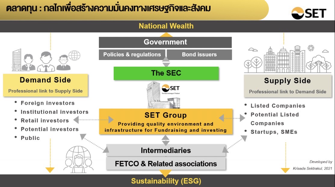 นายแมนพงศ์ เสนาณรงค์ รองผู้จัดการ หัวหน้าสายงานผู้ออกหลักทรัพย์ ตลาดหลักทรัพย์แห่งประเทศไทย (ตลท.) กล่าวระหว่างเป็นวิทยากรในโครงการอบรมความรู้เกี่ยวกับตลาดทุนไทยว่า ตลาดทุนไทยทำให้เกิดกลไกเพื่อสร้างความมั่นคงทางเศรษฐกิจและสังคมให้กับประเทศไทยมาอย่างยาวนาน และเป็นตัวเชื่อมโยงระหว่าง Demand Side ซึ่งประกอบไปด้วยผู้ลงทุนประเภทต่างๆ เข้ากับ Supply Side ซึ่งก็คือบริษัทจดทะเบียน และผู้ประกอบการที่สนใจเข้าจดทะเบียนต่างๆ ทั้งนี้ในโครงสร้างตลาดทุนไทยนั้น จะมีทั้งตลาดหุ้นและตลาดตราสารหนี้ ซึ่งทั้ง 2 ตลาดอยู่ใต้การกำกับดูแลของสำนักงาน ก.ล.ต. ซึ่งได้รับอำนาจการกำกับดูแลมาจากรัฐบาล และในตลาดหุ้นเองก็มีหน่วยงานต่างๆ เป็นองค์ประกอบ