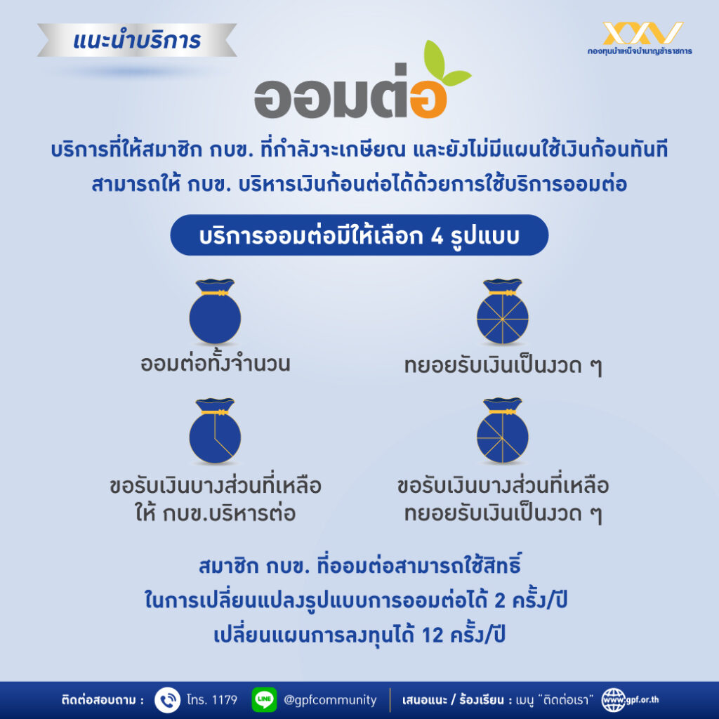 โดยบริการออมต่อมี 4 รูปแบบ คือ 1. ออมต่อทั้งจำนวน 2. ทยอยรับเงินเป็นงวด ๆ อาทิ รายเดือน รายสามเดือน รายหกเดือน หรือรายปี 3. ขอรับเงินบางส่วน ที่เหลือให้ กบข. บริหารต่อ และ 4. ขอรับเงินบางส่วน ที่เหลือทยอยรับเงินเป็นงวด ๆ โดยสมาชิกสามารถเลือกใช้บริการได้ตามความจำเป็นและรูปแบบที่เหมาะสมตามความต้องการของสมาชิก พร้อมทั้งสามารถแจ้งเปลี่ยนรูปแบบการออมต่อได้ปีละ 2 ครั้ง ผ่าน My GPF Application เมนู “ออมต่อ”