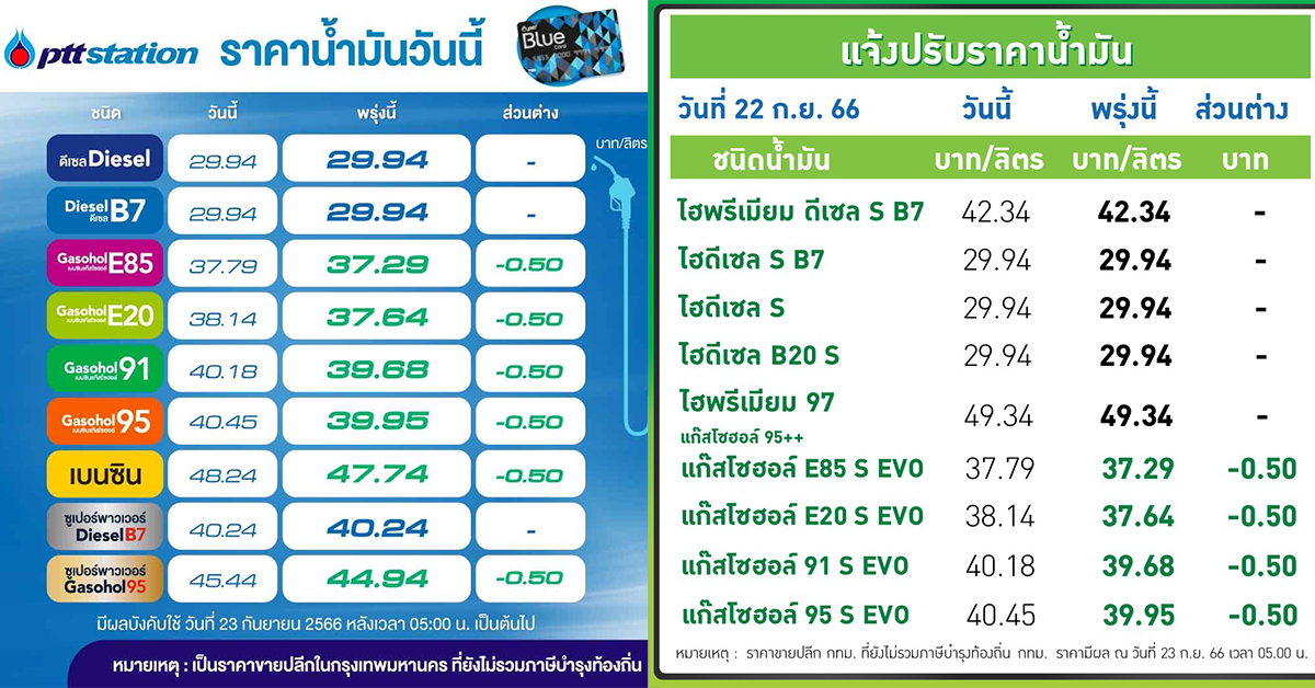 PTT Station ปรับราคาขายปลีกน้ำมันเบนซินและแก๊สโซฮอล์ทุกชนิดลดลง 0.50 บาทต่อลิตร พรีเมี่ยม GSH95 ลดลง 0.50 บาทต่อลิตร ส่วนกลุ่มดีเซลทุกชนิดคงเดิม มีผล 23 ก.ย. 2566 เวลา 05.00 น. เป็นต้นไป โดยราคาขายปลีกจะเป็นดังนี้ ULG = 47.74, GSH95 = 39.95, E20 = 37.64, GSH91 = 39.68, E85 = 37.29, พรีเมี่ยม GSH95 = 44.94, HSD-B7 = 29.94, HSD-B10 = 29.94, พรีเมี่ยมดีเซล B7 = 40.24 บาทต่อลิตร โดยราคาขายปลีกข้างต้นยังไม่รวมภาษีบำรุงกรุงเทพมหานคร