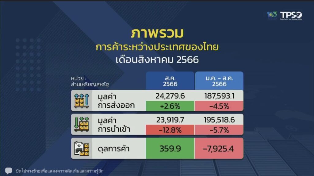 ขณะที่การนำเข้า มีมูลค่า 23,919.7 ล้านเหรียญสหรัฐ หดตัวร้อยละ 12.8 ดุลการค้า เกินดุล359.9 ล้านเหรียญสหรัฐ ภาพรวม 8 เดือนแรกของปี 2566 การส่งออก มีมูลค่า 187,593.1 ล้านเหรียญสหรัฐ หดตัวร้อยละ 4.5 เทียบกับช่วงเดียวกันของปีก่อน การนำเข้า มีมูลค่า195,518.6 ล้านเหรียญสหรัฐ หดตัวร้อยละ 5.7 ดุลการค้า 8 เดือนแรกของปี 2566 ขาดดุล7,925.4 ล้านเหรียญสหรัฐ