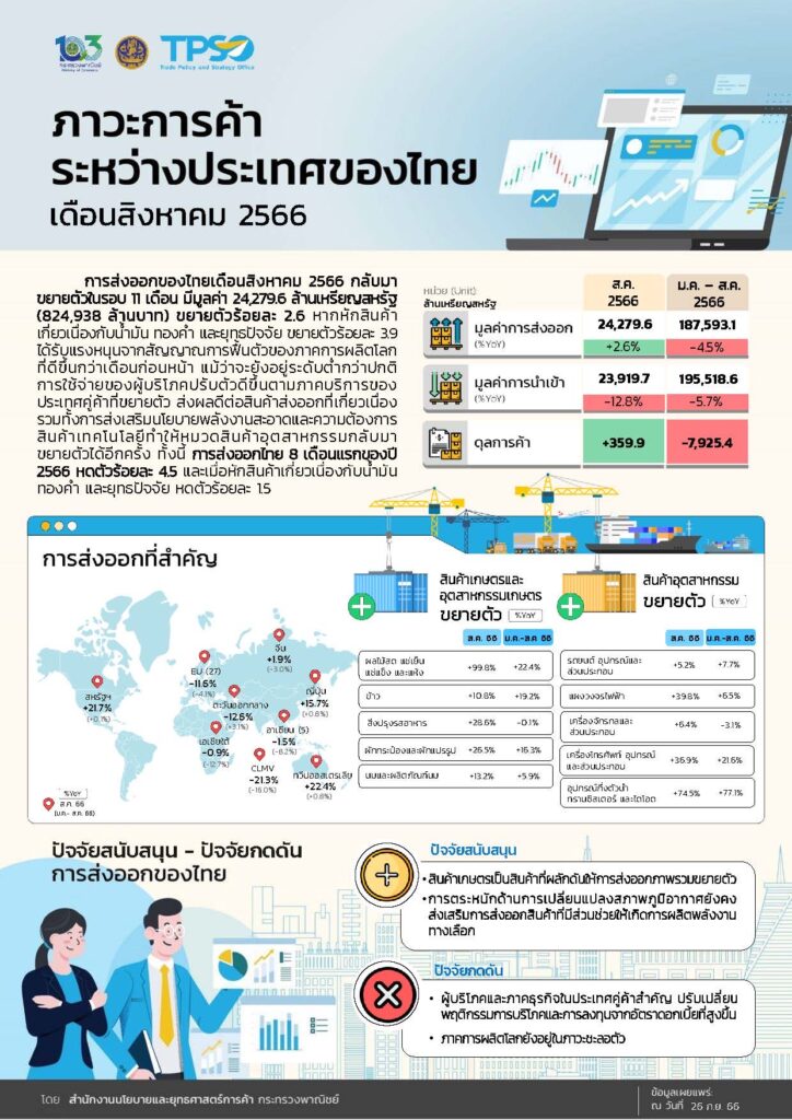 นายกีรติ รัชโน ปลัดกระทรวงพาณิชย์กล่าวถึงการค้าระหว่างประเทศของไทยในเดือนสิงหาคม 2566 พลิกกลับมาขยายตัวในรอบ 11 เดือน มีมูลค่า 24,279.6 ล้านเหรียญสหรัฐ(824,938 ล้านบาท) ขยายตัวร้อยละ 2.6 หากหักสินค้าเกี่ยวเนื่องกับน้ำมัน ทองคำ และยุทธปัจจัย ขยายตัวร้อยละ 3.9 ได้รับแรงหนุนจากสัญญาณการฟื้นตัวของภาคการผลิตโลกที่ดีขึ้นกว่าเดือนก่อนหน้า แม้ว่าจะยังอยู่ระดับต่ำกว่าปกติ การใช้จ่ายของผู้บริโภคปรับตัวดีขึ้นตามภาคบริการของประเทศคู่ค้าที่ขยายตัวส่งผลดีต่อสินค้าส่งออกที่เกี่ยวเนื่องรวมทั้งการส่งเสริมนโยบายพลังงานสะอาดและความต้องการสินค้าเทคโนโลยี