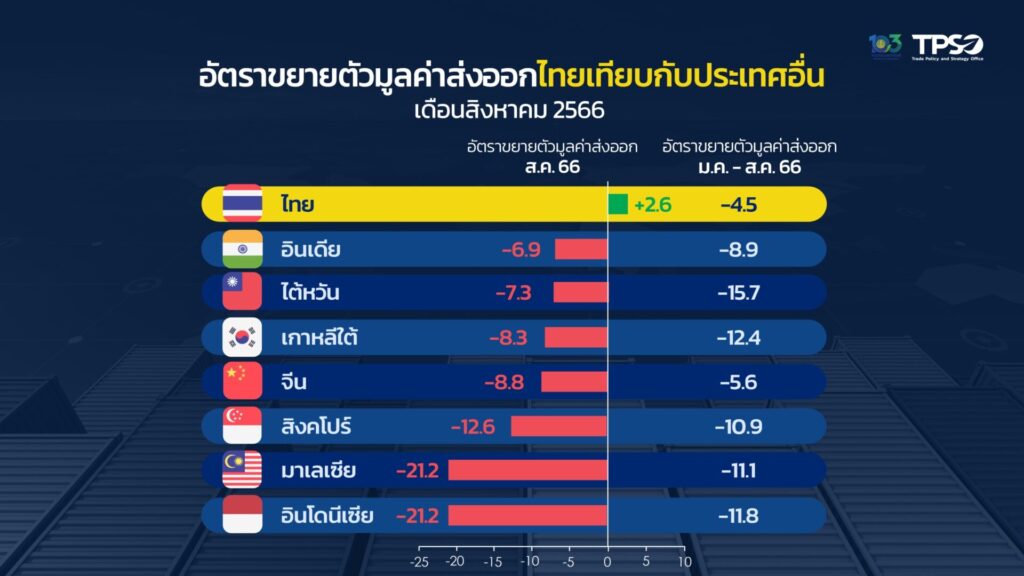 ทำให้หมวดสินค้าอุตสาหกรรมกลับมาขยายตัวอีกครั้ง ประกอบกับการอ่อนค่าของเงินบาทในระดับที่เหมาะสมส่งผลดีต่อการส่งออก ตลาดคู่ค้าสำคัญฟื้นตัวได้ดี อาทิ สหรัฐฯ จีนญี่ปุ่น อินเดีย เกาหลีใต้ ไต้หวัน ออสเตรเลียซาอุดีอาระเบีย และแอฟริกาใต้ โดยการส่งออกของไทยในเดือนนี้ยังทำได้ดีกว่าหลายประเทศในภูมิภาค และกลับมาเกินดุลการค้าอีกครั้ง ทำให้การส่งออกไทย 8 เดือนแรกของปี 2566 หดตัวร้อยละ 4.5 และเมื่อหักสินค้าเกี่ยวเนื่องกับน้ำมัน ทองคำ และยุทธปัจจัย หดตัวร้อยละ 1.5