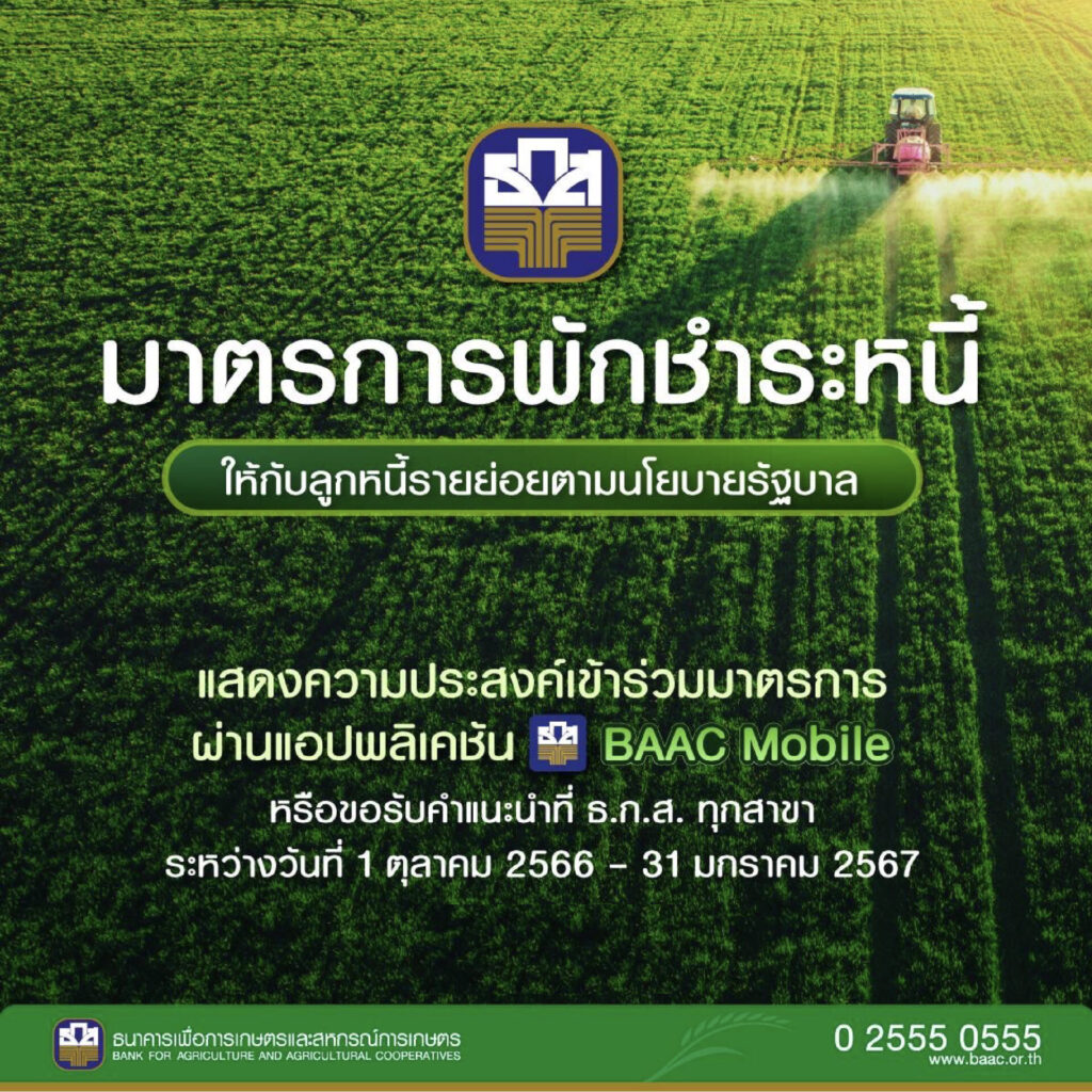 นายฉัตรชัย ศิริไล ผู้จัดการธนาคารเพื่อการเกษตรและสหกรณ์การเกษตร (ธ.ก.ส.) เปิดเผยว่า มาตรการพักชำระหนี้ให้กับเกษตรกร เป็นหนี้ปกติและหนี้ค้างชำระ เงินต้นคงค้าง ณ 30 กันยายน 2566 ไม่เกิน 300,000 บาท จำนวน 2.69 ล้านราย เกษตรกรต้องแจ้งความประสงค์เข้าร่วมมาตรการ เพื่อรับการประเมินศักยภาพ และความสามารถชำระหนี้ การเสริมความรู้ฟื้นฟูทักษะประกอบอาชีพ หากเป็นลูกหนี้ชำระได้ตามปกติ จะเปลี่ยนลำดับการตัดชำระหนี้ต้นเงินและดอกเบี้ยในอัตราส่วน 50:50 ของเงินชำระในแต่ละงวด หากเป็นหนี้ค้างชำระ (NPL) ธนาคารจะจัดสรรชำระต้นเงินให้ทั้งจำนวนที่ส่งชำระในแต่ละครั้ง และเปิดให้ ร่วมมาตรการจูงใจตาม “โครงการชำระดีมีโชค” ของ ธ.ก.ส. ขอย้ำว่า การยื่นความประสงค์ พักชำระหนี้ ต้องเป็นไปตามความสมัครใจของลูกหนี้