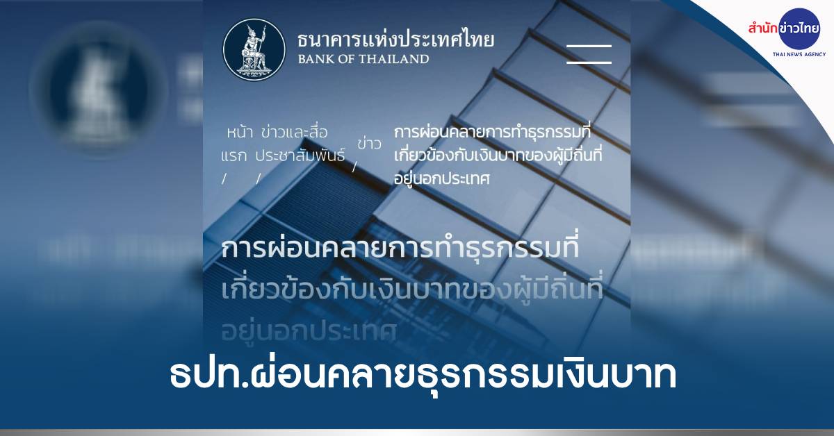 กรุงเทพฯ 26 ก.ย.-ธปท. ผ่อนคลายเกณฑ์การทำธุรกรรมที่เกี่ยวข้องกับเงินบาทของผู้มีถิ่นที่อยู่นอกประเทศ (non-resident) กับสถาบันการเงินในประเทศเพิ่มเติม เพื่อเพิ่มความคล่องตัวและลดภาระด้านเอกสารหลักฐานให้ผู้ประกอบการต่างประเทศที่มีการค้าการลงทุนกับประเทศไทย