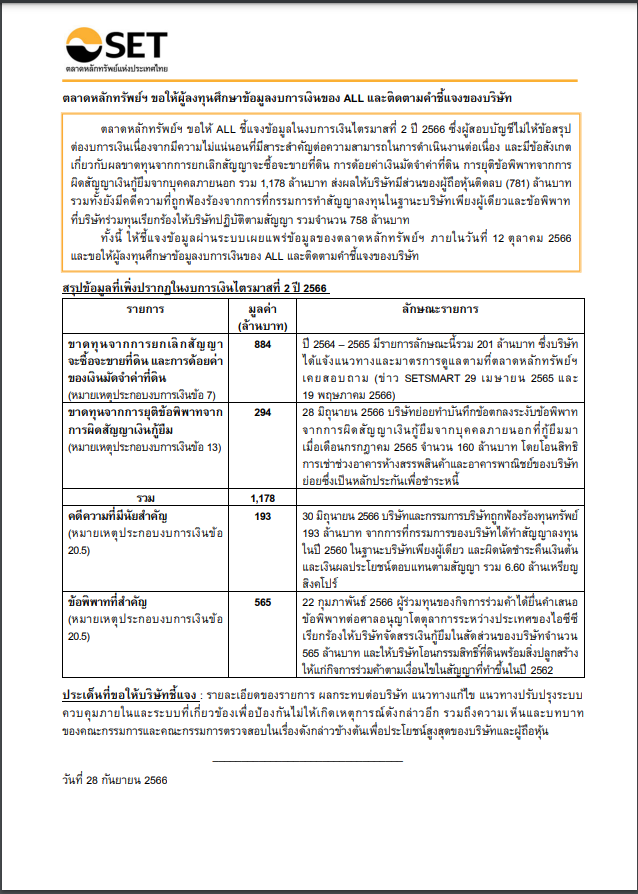ตลาดหลักทรัพย์ฯ ขอให้ ALL ชี้แจงข้อมูลในงบการเงินไตรมาสที่ 2 ปี 2566 ซึ่งผู้สอบบัญชีไม่ให้ข้อสรุปต่องบการเงินเนื่องจากมีความไม่แน่นอนที่มีสาระสำคัญต่อความสามารถในการดำเนินงานต่อเนื่อง และมีข้อสังเกตเกี่ยวกับผลขาดทุนจากการยกเลิกสัญญาจะซื้อจะขายที่ดิน การด้อยค่าเงินมัดจำค่าที่ดิน การยุติข้อพิพาทจากการผิดสัญญาเงินกู้ยืมจากบุคคลภายนอก รวม 1,178 ล้านบาท ส่งผลให้บริษัทมีส่วนของผู้ถือหุ้นติดลบ (781) ล้านบาท รวมทั้งยังมีคดีความที่ถูกฟ้องร้องจากการที่กรรมการทำสัญญาลงทุนในฐานะบริษัทเพียงผู้เดียวและข้อพิพาท ที่บริษัทร่วมทุนเรียกร้องให้บริษัทปฏิบัติตามสัญญา รวมจำนวน 758 ล้านบาท
