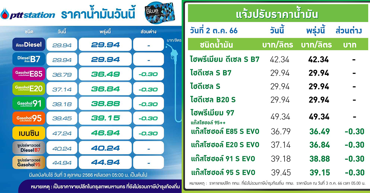 PTT Station ปรับราคาขายปลีกน้ำมันเบนซินและแก๊สโซฮอล์ทุกชนิดลดลง 0.30 บาทต่อลิตร เว้นพรีเมี่ยม GSH95 และกลุ่มดีเซลทุกชนิดคงเดิม มีผล 3 ต.ค. 2566 เวลา 05.00 น. เป็นต้นไป โดยราคาขายปลีกจะเป็นดังนี้ ULG = 46.94, GSH95 = 39.15, E20 = 36.84, GSH91 = 38.88, E85 = 36.49, พรีเมี่ยม GSH95 = 44.94, HSD-B7 = 29.94, HSD-B10 = 29.94, พรีเมี่ยมดีเซล B7 = 40.24 บาทต่อลิตร โดยราคาขายปลีกข้างต้นยังไม่รวมภาษีบำรุงกรุงเทพมหานคร