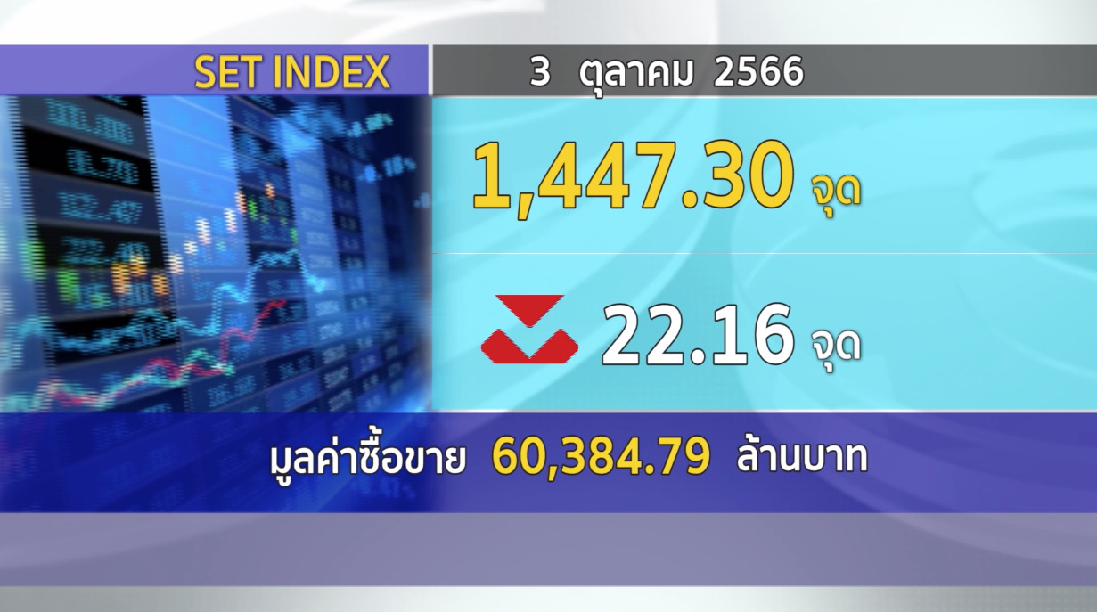 กทม. 3 ต.ค.- SET ปิดวันนี้ที่ 1,447.30 จุด ลดลง 22.16 จุด (-1.51%) มูลค่าซื้อขาย 60,393.44 ล้านบาท