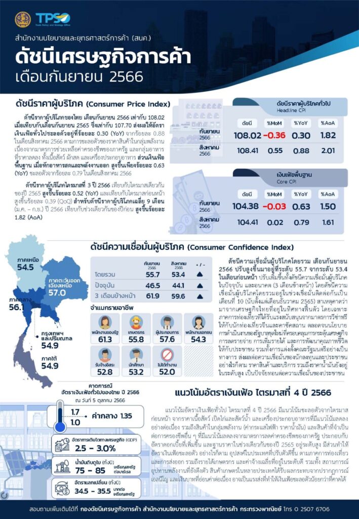 นายพูนพงษ์ นัยนาภากรณ์ ผู้อำนวยการสำนักงานนโยบายและยุทธศาสตร์การค้าหรือ สนค. เผยว่า ดัชนีราคาผู้บริโภคของไทย เดือนกันยายน 2566 เท่ากับ 108.02 เมื่อเทียบกับเดือนกันยายน 2565 ซึ่งเท่ากับ 107.70 ส่งผลให้อัตราเงินเฟ้อทั่วไปชะลอตัวอยู่ที่ร้อยละ 0.30 จากร้อยละ 0.88 ในเดือนสิงหาคม 2566 ตามการชะลอตัวของราคาสินค้าในกลุ่มพลังงาน เนื่องจากมาตรการช่วยเหลือค่าครองชีพของภาครัฐ และกลุ่มอาหารที่ราคาลดลง ทั้งเนื้อสัตว์ผักสด และเครื่องประกอบอาหาร ส่วนเงินเฟ้อพื้นฐาน เมื่อหักอาหารสดและพลังงานออก สูงขึ้นเพียงร้อยละ 0.63 ชะลอตัวจากร้อยละ 0.79 ในเดือนสิงหาคม 2566