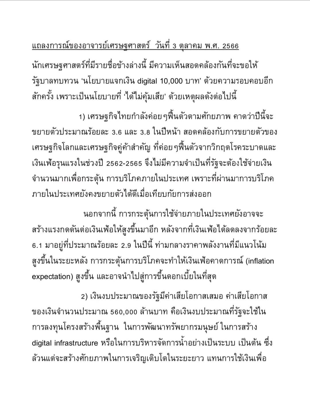 “นักเศรษฐศาสตร์มีความเห็นสอดคล้องกันที่จะขอให้รัฐบาลทบทวนนโยบายแจกเงินดิจิทัล 10,000 บาท ด้วยความรอบคอบอีกครั้ง เพราะเป็นนโยบายที่ได้ไม่คุ้มเสีย” แถลงการณ์ ระบุ